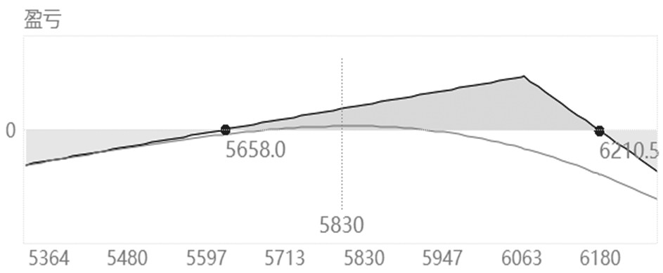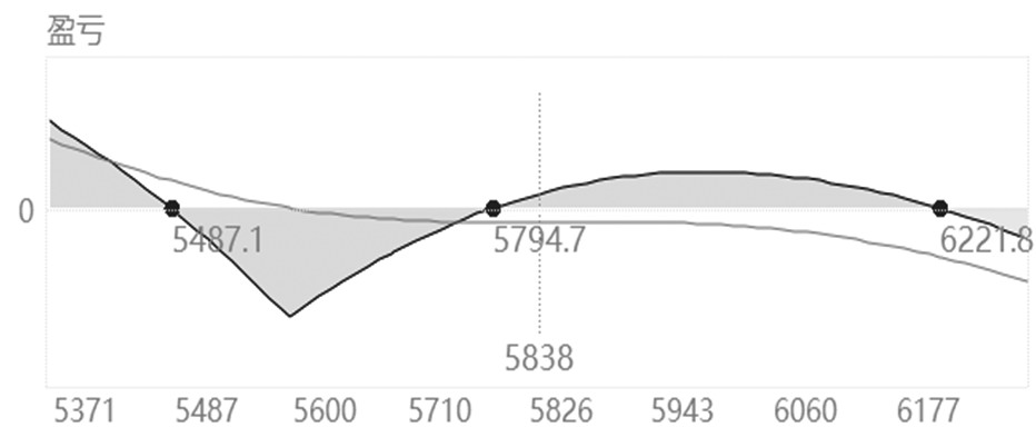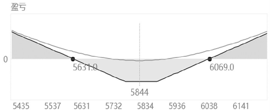 图为负Gamma敞口的Delta中性策略损益曲线 上文分析的Delta与Gamma是从方向维度影响组合损益,除了这两个指标之外,Vega与Theta的影响力也不容小觑。很显然,从该组合的希腊字母参数可以看出,负Vega与正Theta敞口较大,其中,10个组合的Vega值为-264.96,Theta值为85.895,该组合适合隐含波动率下降与时间价值加速衰退的振荡式行情。 正Gamma敞口的Delta中性策略解析 正Gamma敞口的Delta中性策略是指组合的Gamma为正,组合的Delta接近0,这种组合本质上是在做多Gamma和Vega,笔者解析过经典的Gamma Scalping策略,该策略就是基于做多Gamma与做多Vega的策略。组合适合突破式行情,但是在隐含波动率下降与时间价值快速衰退的行情中不利。 在下面图表案例中,构建了双买的中性策略,PTA2405价格为5844元/吨。合约参数方面,看涨期权PTA2405C5900(合约现价85.5元/吨)与看跌期权PTA2405P5800(合约现价83.5元/吨)对应的比例是1∶1,即买入宽跨式组合。建仓初期显示的组合Delta值仅为-0.0081,接近0,符合Delta中性特征,但组合Gamma值较大,当PTA价格上涨20元/吨时,受到Gamma效应的影响,每个组合的Delta值增大0.058,当PTA价格上涨100元/吨时,受到Gamma效应的影响,每个组合的Delta值增大0.29。如果以10个组合计算,上涨20元/吨时,就出现了0.58的Delta敞口,需要补充买入1手平值附近看跌期权维持中性。此外,组合的Vega与Theta敞口较大,双买策略对于标的价格实际变化幅度与隐含波动率的变化非常敏感。每个组合的Vega值、Theta值分别为14.4996与-4.4005,组合在短促大幅涨跌以及隐波上升的行情中有利,反之,在隐波下跌且指数长期窄幅振荡的行情中不利。