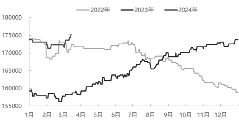 图为浮法玻璃日产量走势(单位:吨) 同时,供应端压力也较为明显。相关数据显示,3月8日至14日,全国浮法玻璃产量122.06万吨,环比增加0.74%,同比增加10.23%。截至3月14日,全国浮法玻璃样本企业总库存6278.3万重箱,环比增加354万重箱。 目前浮法玻璃企业效益较好,产量处在高位,库存连续累积。随着原料成本降低,玻璃生产企业效益较好,短期可能并没有减产保价的急迫需求。此外,浮法玻璃企业生产线冷修也需要时间。2022年至2023年年初,玻璃企业连续亏损之后逐步减产,降低开工率,玻璃期价企稳回升,从1300—1400元/吨低位反弹。