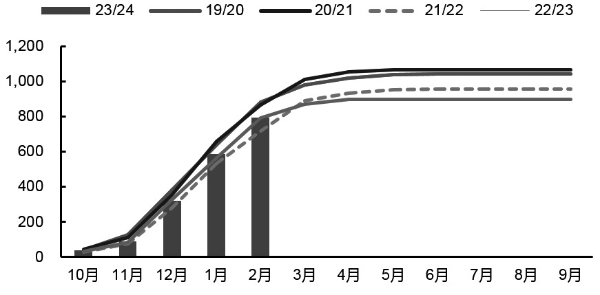图为中国食糖累计产量(单位:万吨) 相关数据显示,截至2024年2月,本榨季全国共生产食糖795万吨,同比增长0.5%;国内白糖销量377万吨,同比增长12%;产销率47%,较前值有所回落。笔者认为,产销率回落的原因一是节前补货透支了部分节后需求,二是节后进入食糖消费的季节性淡季,下游备货情绪不佳。 另外,食糖和替代品进口放量,国内供需矛盾阶段性缓解。2024年1月、2月我国进口糖分别为70万吨、49万吨,较上年同期分别增长22.6%、58.8%;1—2月份我国累计进口糖119万吨,同比增长35.4%。1—2月我国糖浆和预拌粉共进口16.83万吨,同比增加2.01万吨,增幅13.56%。因此,虽然国内糖库存水平较低,但进口量增加,供需矛盾出现阶段性缓解。 综上,预计在二季度原糖价格偏弱的情况下,郑糖或维持偏弱振荡走势,但受低库存支撑,下方空间有限。(作者单位:中信期货) (责任编辑:admin) |