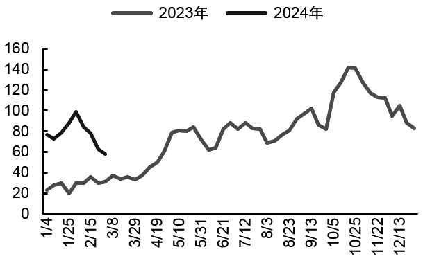 图为巴西中南部食糖产量(单位:百万吨) 2024/2025榨季,巴西将再度迎来丰产年份。当前巴西糖醇价差为8.47美分/磅,制糖的经济优势相对明显,巴西糖厂大概率会开足马力生产原糖。预计2024/2025榨季巴西糖醇比仍将处于历史高位,制糖比有望达到51.5%—52.5%。假设2024/2025榨季巴西中南部甘蔗压榨量6.03亿吨,出糖率与上榨季持平,新季糖产量有望达到4200万吨以上,叠加处于历史高位的结转库存,原糖整体供应预期偏宽松。 笔者认为,2023年2月底开始原糖价格大幅上涨的推动因素之一就是巴西港口物流拥堵。但从当前情况看,巴西等待装运的船只数量和等待装运的食糖数量正稳定减少,这意味着3—5月巴西原糖将源源不断地流入市场。因此,除供应增加外,巴西通畅的港口物流将成为压制原糖价格的另一利空因素。