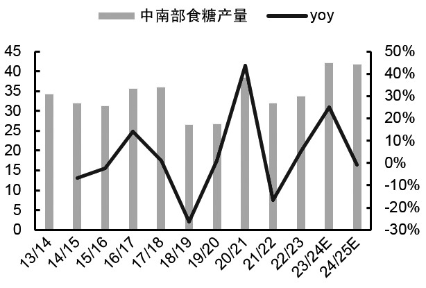 图为巴西港口等待装运的船只数量 印度方面,有消息称,印度政府将把2024/2025榨季甘蔗最低收购价从之前的3150卢比/吨上调至3400卢比/吨,远期甘蔗收购价的提高或进一步提升当地的甘蔗种植意愿。因此,笔者认为,2024/2025榨季印度食糖产量有望上调。 泰国方面,甘蔗种植效益有所恢复,食糖产量将迎来恢复性增长。泰国把2023/2024榨季甘蔗的初步收购价定为1420泰铢/吨(约285元/吨),同比增长31%。笔者认为,泰国2023/2024榨季减产的主要原因是木薯挤对甘蔗种植面积以及厄尔尼诺现象导致产地降水减少,甘蔗收购价提高后甘蔗的种植效益将超过木薯,因此2024/2025榨季秦国食糖产量将出现恢复性增长。 总之,二季度原糖的核心交易逻辑在巴西丰产预期的兑现上,当前巴西糖醇价差处于高位,制糖经济性较好,2024/2025榨季食糖产量或在4200万吨以上,在港口物流顺畅背景下,原糖盘面价格将承压。 国内方面,市场普遍预期2023/2024榨季国内食糖产量在980万—1000万吨,目前国内糖厂尚未完全收榨,当前收榨糖厂数量较去年同期明显减少,食糖增产的确定性较强。