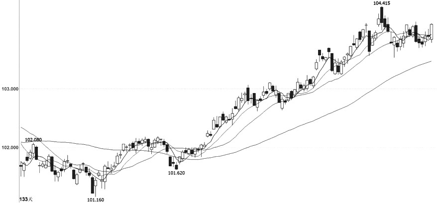 IC加权近期价格回调至60日均线位置获得一定支撑,日线架构形成止跌企稳形态。量能方面,价格止跌企稳过程中成交量变化不大,持仓量先增后减。指标方面,短期均线走势偏弱,60日均线处于水平走势,MACD指标绿色能量柱有所收敛。综合来看,IC加权近期价格跌至60日均线位置止跌企稳,建议以该位置为防守继续偏多思路对待。 十债 高位整理