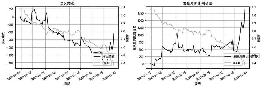 图为看跌期权和看涨期权反向比例价差盈亏结构 上图为案例当中看跌期权反向比例价差盈亏结构图,50ETF收盘价格为2.463,从图中可知平值的点位是在买进行权价的点位附近,接近2.45。这样构建的好处有两点,一是因为买入部位的行权价是在盈亏结构图的最低点位置,也是整个组合中亏损最大的点位,且反向比例价差是对行情走势有预测的策略,一旦出现趋势行情,组合就会获利,同样一旦行情出现反转,组合亏损也可以降低,上涨同样可以盈利,所以只要把最大损失点控制在平值附近,只要行情出现较大波动,远离当前行权价整体就可以开始获利。二是从希腊字母的角度来看,由于卖出的实值看跌使组合Delta中性,那么该策略盈利的关键就是正Gamma,在平值处期权的Gamma值最大,所以优先选择平值处构建该策略。此外,与正向比例价差策略类似,反向比例价差可以通过对比例的调整来灵活控制整个组合的Delta值和Gamma值,2∶1是较为常见的仓位比例。 [反向比例价差策略的特性] 对于反向比例价差策略而言,假如判断对了后市标的方向,可以通过买方权利金收益大幅增加的优点获利;如果判断错误,那么可以获取卖出实值期权的权利金收入,相对单买策略有一定优势,唯一需要注意的是假如行情始终不出现大幅波动,则可能出现比单买策略要大的损失,但最大损失仍是可控的,不会出现额外的风险,与期权的买方类似,最大亏损是有限的,而获利可能是无限的,并且在建仓初始就可以确认最大亏损,这对于风险意识较强的投资者而言是好的特性。 常见的Gamma Scalping策略对比 在常见的Gamma Scalping策略当中,投资者最常见的就是反向比例价差和双买跨式策略,Gamma Scalping策略往往是指使得初始时Delta尽可能维持在零,Gamma为正,Theta为负,在牺牲时间价值的前提条件下,换取标的尽可能出现大幅波动从而获利。为了更好地展现两种策略在相同趋势性行情中的表现,本部分将通过期权回测的方式来测试两种策略的表现。 2022年下半年股票市场受到国内外多种宏观因素的冲击出现趋势性下跌,累计跌幅接近30%,利用此两种策略防止股市出现“黑天鹅”事件会起到较好的效果。在此背景条件下进行两组基于50ETF期权的回测,第一组为买入平值跨式,第二组为以2∶1的持仓比例采用平值和虚值两档看跌期权构建反向比例价差。 从回测结果可知,两种策略均胜率较低,在小波动的交易日中总是出现小亏的情况,只有在标的出现极端行情时才可以盈利。对于买入跨式,由于同时付出买看涨和买看跌的权利金,时间价值损失较大,除非出现极端行情才可以盈利,否则持续保持亏损。相反,反向比例价差由于存在卖出实值看跌权利金的收入,即使买看跌并没能很好地盈利,卖出实值看跌有效弥补了时间价值的损失。在出现极端行情的下跌中,看跌反向比例价差由于是买入2手平值看跌,相对而言组合的Gamma值较大,可以大幅度获得标的下跌带来的收益。
