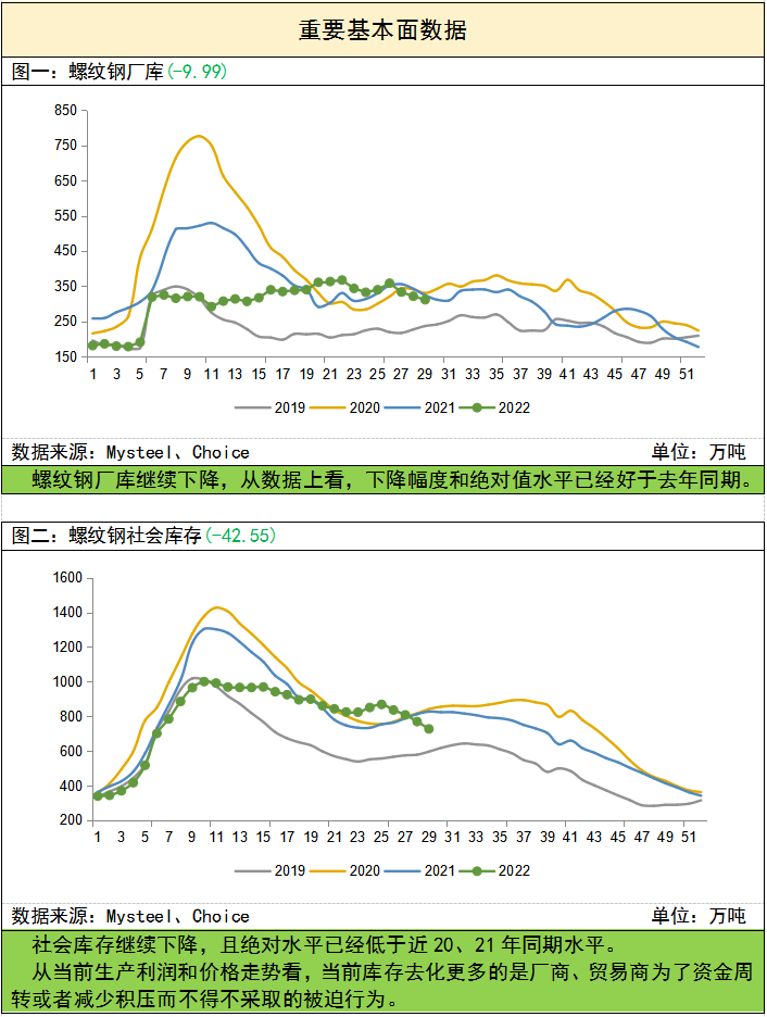 | 一相关价格 ![]() 二重要资讯及解读 【一周行业重要资讯】 中钢协召开二季度部分钢铁企业经济运行座谈视频会议。企业代表认为,在国家稳增长的目标下,随着疫情防控政策调整和复工复产的推进,钢材需求将逐步释放,基础设施建设发力将对钢铁需求产生一定的拉动作用。钢材价格水平有望跟随需求有效释放震荡上行。 工信部原材料工业司组织召开建材行业上半年运行分析会。会议指出,下半年建材行业经济下行压力较大,要清楚认识到当前发展中困难,保障产业链供应链安全稳定和行业稳健发展。 沙钢自7月12日起废钢价格整体下调150元/吨,本月沙钢已四次下调废钢采购价格,累计下调300-350元/吨。 海关总署最新数据显示:6月中国进口钢材79.1万吨,同比下降36.7%;1-6月累计进口钢材577.1万吨,同比下降21.5%。6月中国出口钢材755.7万吨,同比增长17.0%;1-6月累计出口钢材3346.1万吨,同比下降10.5%。 据中钢协数据,2022年7月上旬,重点钢企粗钢日均产量207.48万吨,环比下降1.98%;钢材库存量1804.79万吨,比上一旬(即上月底)增加109.93万吨,增长6.49%。 上周钢材总库存量2043.02万吨,周环比减少47.82万吨。其中,钢厂库存量610.28万吨,周环比减少13.08万吨;社会库存量1432.74万吨,周环比减少34.74万吨。 7月14日Mysteel统计新口径114家钢厂进口烧结粉总库存2849.98万吨,烧结粉总日耗106.31万吨。新口径114家钢厂剔除长期停产样本后不含税铁水成本3339元/吨。 247家钢厂高炉开工率76.98%,环比上周下降1.55%,同比去年下降6.90%;高炉炼铁产能利用率84.01%,环比下降1.70%,同比下降3.99%;钢厂盈利率13.85%,环比下降3.03%,同比下降68.83%;日均铁水产量226.26万吨,环比下降4.58万吨,同比下降10.14万吨。 上周40家独立电弧炉建筑钢材钢厂平均成本为4056元/吨,周环比减少214元/吨。平均利润为6元/吨,谷电利润为107元/吨,周环比增加35元/吨。 唐山地区主流样本钢厂平均铁水不含税成本为3111元/吨,平均钢坯含税成本4032元/吨,周环比下调131元/吨,与7月13日当前普方坯出厂价格3650元/吨相比,钢厂平均毛利润亏损382元/吨。 【解读】 行业基本面方面继续向好:上周螺纹钢产量下降9万吨;厂库下降10万吨;社会库存下降42.55万吨。产量继续下降,库存继续去库。 市场差、预期也差:上周螺纹钢期现货均出现暴跌,上海螺纹钢现货跌450元/吨,而期货主力10合约下跌超600元,现货基差走强,表明市场对预期较为悲观。 上周暴跌主要有几个原因:一是行业减产力度并不足以快速改善供需平衡,中钢协数据显示7月上旬重点钢企粗钢日均产量207.48万吨,环比下降1.98%,降幅在当前市场环境中显得可谓微不足道;二是虽然在淡季不断去库存,但此类去库存中多是由于需求不佳,为了资金周转或者减少积压而不得不采取的被迫行为;三是大宗商品原油和铜等继续下跌,使得整体商品估值进一步下降;四是随着时间的推移,2210合约逐渐接近交割日期,而此前炒作的“强预期”,由于各地疫情、高温等因素,始终未能有效落地,因此在有效需求未能释放的情况下,对应的2210主力合约进一步被打压,也带动整个黑色产业链价格出现大跌。 总体来说,近期整体宏观商品估值在下降,行业基本面不断在转好但难以改变2210合约现状。相关政策刺激预计出台和落地将在下半年以及明年,长期来看可关注远月合约。 三相关附图 ![]() ![]() ![]() ![]() ![]() ![]() (文章来源:东方财富研究中心) (责任编辑:admin) |
