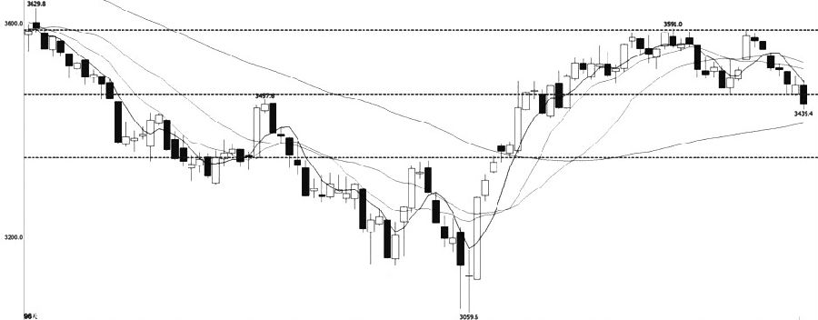 IF加权近期价格反弹至前期高点3591点一线后遇阻回落,日线架构形成双顶破颈线的形态。量能方面,近期价格下跌过程中,成交量和持仓量变化不大。指标方面,短期均线跟随价格走弱,60日均线延续偏强运行,MACD指标快慢线继续向零轴回归。综合来看,IF加权近期承压回落并跌破3470点一线支撑,下方关注3350点一线支撑表现。 IC 缩量整理