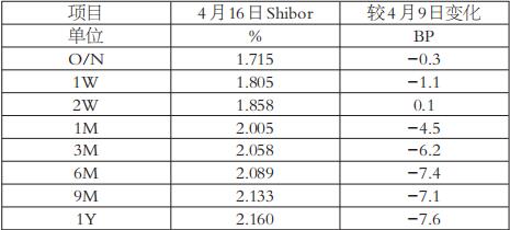 本周,国内市场利率整体呈现弱势格局。其中,短期利率受月中缴税缴款的影响,变化不大;中长期利率受融资数据欠佳的影响,大幅下滑。截至4月16日,上海银行间同业拆放利率(Shibor)隔夜、1周期、1月期、3月期、6月期、9月期、1年期利率分别报收于1.715%、1.805%、2.005%、2.058%、2.089%、2.133%、2.16%,较4月9日分别下降0.3、1.1、4.5、6.2、7.4、7.1、7.6BP。