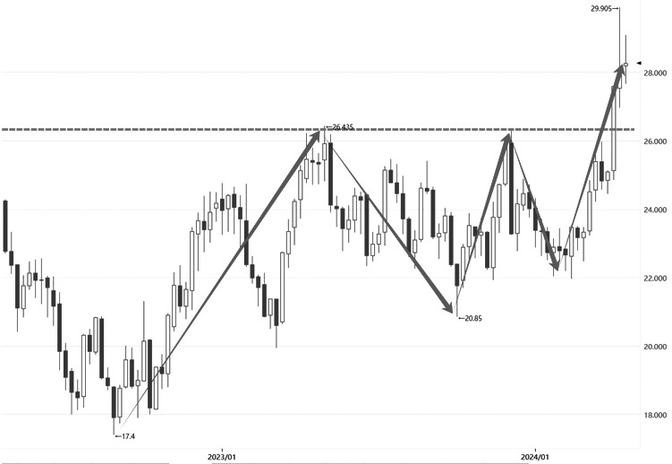 图为纽约金主连合约月线走势(单位:美元/盎司) 第二,贵金属价格走强或预示着美元资产正遭受抛弃。黄金价格与美元指数的脱钩或预示着全球以美元为信用、计价结算货币的金融体系正经受考验。叠加地缘政治局势影响,在各类风险和不确定性背景下,当前具有避险功能的黄金的配置价值正在凸显。近年来美国国债价格一路大跌,美债规模不断扩大,美国财政赤字居高不下。去年美国出现的债务危机仍历历在目,中国在2023年连续7个月抛售美债,2023年10月中国持有美债规模创2009年以来新低。另外,近年来美股指数不断刷新历史高位,在贵金属价格保持坚挺的同时,近两周美股市场出现了较大幅度的回调,笔者认为这种现象应该引起投资者的重视。央行为维持人民币汇率和我国外汇储备的稳定,已经连续17个月增加黄金储备,这某种程度上已经说明了当前资产配置的新方向。 总结来说,当前贵金属市场的表现不仅打破了之前的惯有逻辑,甚至还打破了技术层面约束。白银方面,供需面基础更为牢固。作为工业原料,近几年光伏行业白银需求明显增加,整体表现出供应缺口逐步放大的趋势。世界白银协会公布的最新数据显示,2023年全球白银供应缺口为4400吨左右。预计2024年供应缺口仍处于高位,将达到5000吨左右。在此特殊背景下,白银市场行情表现出异常强势的节奏。从纽约银主连合约周线图看,3月22日当周阴线回调,调整后继续向上突破。纽约白银主连合约成功突破26.4美元/盎司附近压力位。短期看,技术层面的调整存在两种可能:第一是大幅回调,回踩支撑位;第二是振荡调整,表现出一定抗跌性。