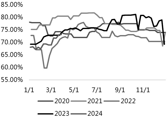 图为中国烧碱月度出口数据(单位:万吨) [下游核心行业对烧碱出口存在一定扰动] 烧碱下游涉及领域广泛,包含氧化铝、印染化纤、造纸、新能源前驱体、军工、水处理等。由于造纸行业生产过程中烧碱的消耗、回收率均朝着“绿色”方向发展,且烧碱作为辅剂对纸业成本端影响不大,故造纸通常难作为烧碱需求或交易的主要驱动。印染化纤产能变化不大,难给到烧碱明显需求增量,但伴随着海外去库存步入尾声,国内纺织品类出口向好,从预期上予以烧碱需求端一定支撑。氧化铝行业则由于需求占比大(超30%)、行业集中度较高,具备较强的区域议价能力,成为烧碱下游最重要的影响因素之一。 根据对烧碱下游产业链的分析,核心行业如氧化铝、印染化纤均在进出口端具备一定的制约或增长点,对行业整体生产、成本利润带来扰动进而影响烧碱需求。 氧化铝:铝土矿供应问题仍是制约氧化铝生产的主要因素之一 我国氧化铝生产以拜耳法为主,从单吨氧化铝耗烧碱量看进口与国产铝土矿存在差异,进口约为0.1吨,国产约0.2吨,由于我国铝土矿进口依存度超过60%,综合估算单吨消耗在0.15吨左右,烧碱占氧化铝生产成本的16%—20%。除了氧化铝产量高低对烧碱需求造成直接影响外,从成本角度看氧化铝利润高低同样影响烧碱价格。 氧化铝当前面临“上有制约下有顶”的局面。由于下游电解铝产能已逼近4500万吨产能红线,后续产能增量多以国内新项目产能置换的形式落地,加之目前电解铝产能利用率已持续维持在95%的高位,产量上限导致氧化铝需求上方空间不足。上游方面,由于供不应求,大量从海外进口原料,我国铝土矿对外依存度自2020年以来维持在50%—70%,主要来源为几内亚、澳大利亚。 进口铝土矿成为影响氧化铝供应、价格预期的主要因素之一。 2023年12月中旬,由于几内亚油库爆炸导致市场对几内亚铝土矿出货量产生缩量担忧,国内氧化铝期货出现上市以来首次涨停,烧碱盘面受下游成本估值预期带动当日同样冲高,主力合约一度涨至2970元/吨一线;此后氧化铝价格中枢明显上移,在利润驱动下国内氧化铝企业生产积极性提升,但受制于原料供应等问题,开工同比偏低。综合来看,判断阶段性氧化铝对烧碱需求的影响,需关注氧化铝原料供应不足问题能否有效缓解,进口铝土矿在其中扮演着重要角色。 印染化纤:海外清库存后出口走强为烧碱需求提供支撑预期 从国内印染布、粘胶短纤产量来看,近5年均呈现窄幅波动格局,产量重心分别在550亿米和400万吨,产量的波动主要是近年需求不足造成的。纺织业能否维持产量回升势头仍是2024年烧碱需求端的主要变量之一。目前看2024年前两个月纺织服装业出口同比大幅好转,2月纺织纱线织物、服装及衣着物件出口同比分别增长31.9%和22.2%。出口转强的主因是海外品牌清库存已处于筑底阶段,根据美国服装及面料批发商库存数据来看,压力自2023年9月已减轻。尽管目前纺织业反馈“金三银四”小旺季下游大单仍不足,内需显疲态,但出口端亮眼仍提振纺织行业生产积极性,对烧碱需求来说可起到“乐观”支撑作用。