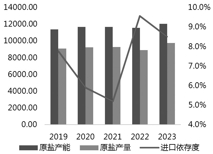 我国是烧碱净出口国,总体看烧碱进出口依存度均不高,但相较于出口而言,进口体量过于微小,故市场更关注于出口端。本文从进出口角度梳理我国烧碱产业链中值得关注的品种及其进出口量对烧碱价格的影响。 [原盐难形成对烧碱价格有效的成本驱动] 烧碱产业链呈现扁平化特点,即链条长度较短、同一“层级”涉及品种覆盖面丰富。烧碱作为盐化工品,生产方式以电解饱和食盐水为主,生产成本包含电力、人工、原盐等,其中电力成本占比较大,接近六成。尽管我国有部分电煤进口,但推算至具体电费误差较大,电力成本则根据工业用电报价以及部分自备电厂的具体调研而估算。 烧碱主要原料成本为原盐。我国是全球原盐产能和产量最大的国家。近年来,我国盐业供给能力及发展水平稳定,据中国盐业协会数据,截至2023年年底我国原盐产能突破12000万吨,产量9700万吨,折算产能利用率为80%。同时我国也是原盐净进口国,2022—2023年平均年进口量在900万吨以上。 结合国内原盐产能、产量格局与进口量来看,我国原盐供应并不存在明显的缺口,产能利用率当前在80%附近,有一定弹性;而进口依存度在2022—2023年进口放量期间也只有8%—9%,因此很难说国内原盐供不应求导致了进口弥补缺口的局面。更主要的因素在于沿海区域作为原盐主要消费区域之一,综合物流及仓储等成本估算进口盐具备一定经济优势。数据显示,2023年我国进口盐总量为908.5万吨,进口平均单价44.76美元/吨。按同期美元平均汇率计算,进口到港价格为356元/吨,国内平均送到价格为394元/吨。此外,由于存在丰产期、“春扒秋扒”,进口量也会受到供应淡旺季的影响。