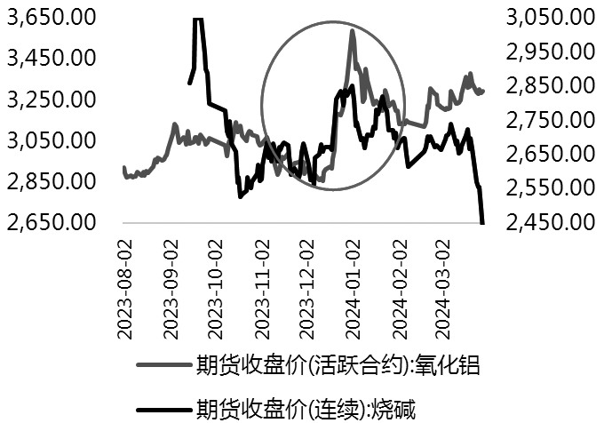 图为氧化铝、烧碱期货价格走势(单位:元/吨)
