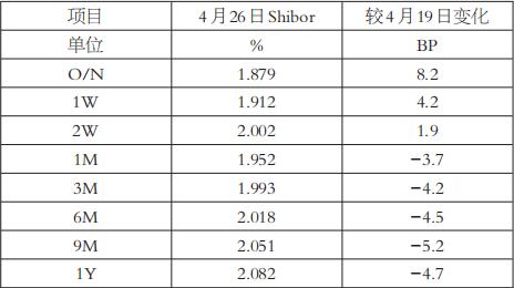 上周,国内市场利率呈现短强长弱的态势。一方面,随着五一小长假和月末资金需求高峰的来临,短期市场利率持续上升;另一方面,在国内资金需求整体疲软和资金供应充裕的共同作用下,中长期利率延续走弱的态势。截至4月26日,上海银行间同业拆放利率(Shibor)隔夜、1周期、2周期利率分别报收于1.879%、1.912%、2.002%,较4月19日分别上升8.2、4.2、1.9个基点;1月期、3月期、6月期、9月期、1年期利率分别报收于1.952%、1.993%、2.018%、2.051%、2.082%,较4月19日分别下降3.7、4.2、4.5、5.2、4.7个基点。