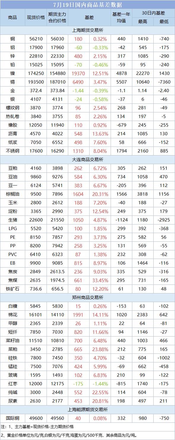 基差报告:7月19日国内商品基差数据一览
