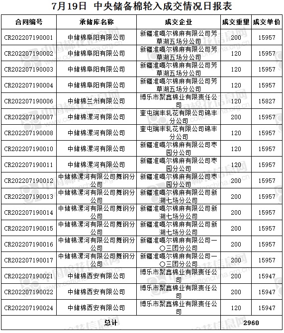 7月19日储备棉轮入结果:成交率49% 成交均价15950元/吨 中国棉花信息网 07月19日 7月19日中央储备棉轮入上市数量6000吨,实际成交2960吨,成交率49%。今日平均成交价为15950元/吨,较前一日下跌540元/吨。 其中内地库成交2960吨,成交承储库5家。 今日成交情况如下:(文章来源:中国棉花信息网) (责任编辑:admin)