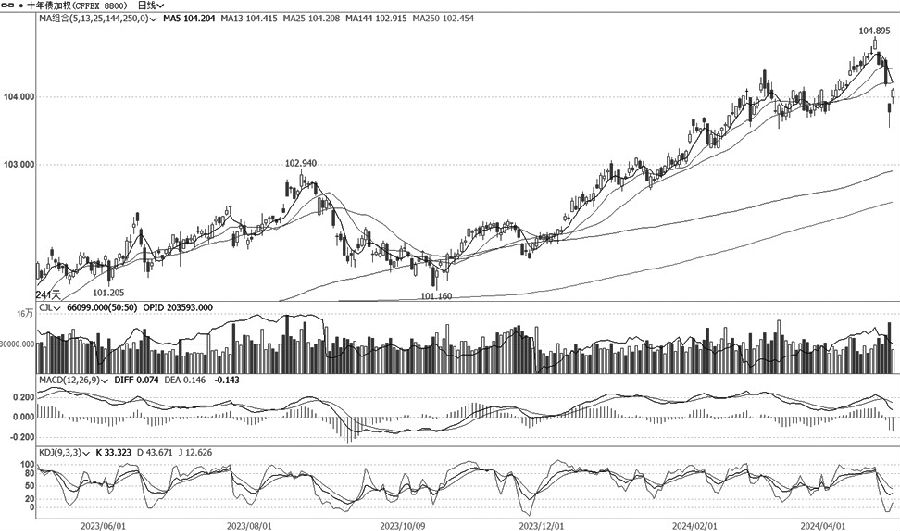 节前IC加权连续突破后短调企稳,且量仓指标更趋于有利。上周二早盘高开低走,震荡回落,盘中一度维持震荡偏弱走势,至尾盘以小阴线报收。当前主连合约较现货指数接近平水,净基差波动继续收窄,短期期货较现货指数表现略偏弱。IC主连合约减仓较多,远月合约仓位加减不一,整体仓位明显缩减,同期成交量能较前几个交易日大幅缩减,近期量价仓等指标将形成合力,操作上以上涨趋势策略为主。IC当前MACD红柱继续放大,KDJ快线在高位运行,日K线连续上涨,建议多单加仓持有。 十债 观望为主