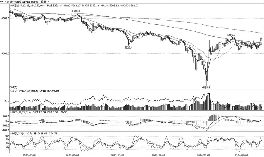IF突破后上行走势基本确定。五一节前IF加权由震荡走势转为突破上行,且量仓等指标趋同性较为明显。上周二早盘IF加权高开低走,盘中延续震荡趋弱走势,最终以小阴线报收。IF主连合约较现货指数保持小幅升水,净基差再现波动性,期货走势较现货指数表现偏弱。IF加权MACD指标红柱有望走扩,KDJ快线在高位运行。主连合约减仓较多,同期远月合约亦以减仓为主,总体表现为减仓缩量震荡。短期内市场突破后蓄势上行需量能的进一步配合,关注节后上行的力度,建议多单持有。 IC 向上突破