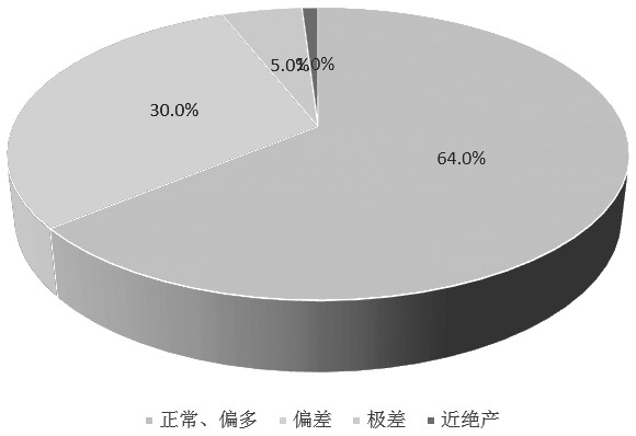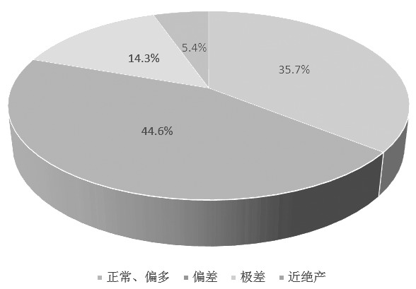 在每个县区,我们选取了一定数量的样本点,对果园的坐果情况进行了分类描述,包括正常及偏多(正常和偏多归为一类)、偏差、极差、近绝产等状态。其中,偏多代表坐果较好,增产10%以上;正常代表坐果情况与正常年份基本持平,产量在±10%范围内;偏差代表坐果较少,减产幅度在10%—30%;极差代表坐果很差,减产幅度在30%—50%;近绝产代表坐果非常差,减产幅度大于50%。 陕西产区白水县调研情况如下:白水县苹果物候期处于幼果期。调研区域包括白水县林皋镇、杜康镇、尧禾镇、雷牙镇、史官镇等五个苹果种植乡镇。整体来看,白水县富士苹果坐果整体不佳,而嘎啦等早熟品种坐果正常。从数据上看,白水县共采样61个果园,其中5个为早熟果园,56个为晚熟富士果园。5个早熟果园全都坐果正常及偏多。56个晚熟富士果园中,坐果正常及偏多的有20个,占比35.7%;坐果偏差的有25个,占比44.6%;坐果极差的有8个,占比14.3%;坐果近绝产的有3个,占比5.4%。从数据上看,白水县坐果正常及偏多的果园占比仅35.7%,表明白水县整体坐果情况减产已定。