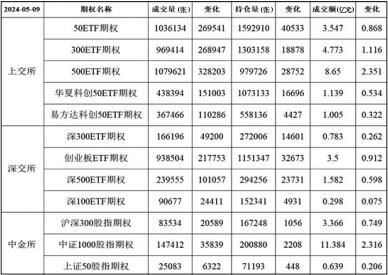 5月9日,沪深两市放量大涨。期权方面,当前各品种期权标的均收红,各品种期权购沽隐波涨跌不一,多数触底反弹,上证50、沪深300期权隐波处于历史低位,其余期权隐波整体处于历史均值附近,市场情绪中性偏积极。 盘后数据显示,50ETF期权市场活跃度继续上升,持仓延续增加。当日期权总持仓量1592910张,较前一交易日增加40533张。其中,认购合约持仓766855张,较前一交易日减少9165张,认沽合约持仓826055张,较前一交易日增加49698张,持仓量PCR为1.0772,较前一交易日增加0.0768。成交量方面,当日全市场合计成交1036134张,较前一交易日增加269541张。其中,认购合约成交528789张,较前一交易日增加145212张,认沽合约成交507345张,较前一交易日增加124329张,成交量PCR为0.9594,较前一交易日减少0.0391。