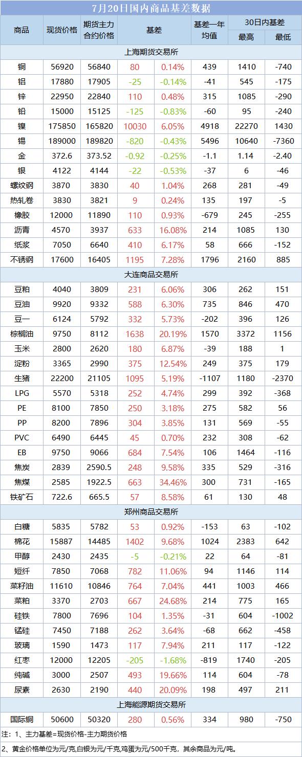 基差报告:7月20日国内商品基差数据一览