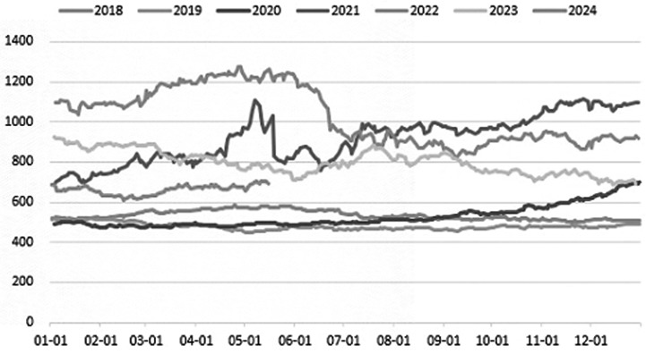 图为沿海菜籽压榨情况(单位:万吨)