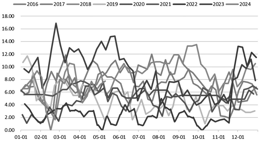 图为进口菜籽压榨利润(单位:元/吨) 4月底以来,菜油期价表现亮眼。尽管当前国内菜油供需局面较为充裕,但欧洲菜籽在花期遭遇霜冻仍引发市场对菜油供应压力的担忧。受此影响,菜油2409合约自4月22日的阶段性低点开始大幅反弹。展望后市,笔者认为,在强预期与弱现实分化背景下,预计未来多空博弈将有所增强,菜油盘面波动率也将相应提升。 欧洲菜籽减产对整体供需影响有限 在种植面积下滑引致同比减产的背景下,4月底欧洲菜籽在花期遭遇霜冻进一步引发市场对菜油供给压力出清的猜想。部分非主流机构给出200万~400万吨甚至更高的霜冻减产预估,受此影响,欧菜籽期价大幅上涨,并引燃了市场的做多情绪。然而,市场主流机构对欧洲霜冻影响的评估并没有那么高。战略谷物、油世界、欧盟统计局、美国农业部对欧洲新季菜籽产量的最新预估分别为1810万、1832万、1946万、1900万吨,虽然低于2023年2000万吨左右的产量,但对霜冻引致的减产预估仅在数十万吨,这成为菜油市场的多空分歧点之一。