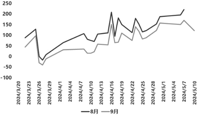 图为菜油、棕榈油2409合约价差走势(单位:元/吨) 去年9月至今年2月期间,在2023/2024年度加拿大菜籽减产远不及预期,且其出口受澳菜籽增产大幅冲击的背景下,国内菜油期价遭遇持续下跌。欧洲、日本等地区转向廉价的澳菜籽进口,令加拿大菜籽对华出口依赖度显著提高。进口菜籽榨利持续开启,使得国内压榨菜油供应逐渐充裕。伴随着春节后棕榈油显著转强,菜油、棕榈油价差跌至历史低位,但随着4月10日开斋节后棕榈油价格转弱,市场对菜油、棕榈油价差低位修复的预期增强。 虽然欧洲新季菜籽减产预期基本形成,但我们更倾向于支持主流机构数十万吨减产级别,且影响量级有限。此外,在全球大豆扩产的背景下,预期大豆等其他油菜籽进口增长亦能弥补欧洲菜籽减产带来的供应缺口,这将限制后期欧菜籽进口增长的空间。而从节奏上看,欧菜籽将在6—7月开启收割,集中上市期,进口需求将相应弱化,减产引致的进口增量可能需到市场年度后期方能显现,菜油市场强预期兑现仍需时日。至少从目前来看,我们并未观察到加拿大菜籽出口显著提速的情况,因而近期加拿大菜籽报价涨幅也较为保守。