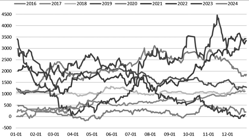 图为成都一级菜油与一级豆油价差走势(单位:元/吨) 上周五美国可能对华加征UCO进口关税的传闻使得美豆油期价大涨。美豆油及加菜油同作为美国生柴原料,如果美国进口UCO的数量因此出现下滑,将带来其他生柴原料的边际需求增量,这一度提振前几日的加拿大菜籽报价,并带来国内菜油相较豆油及棕榈油更高的涨幅。然而,本周二美国公布的对华加税清单中并未包含UCO,市场预期落空令美豆油大幅回吐风险升水,周二晚间菜油亦呈现明显的多头减仓迹象。伴随着菜油、棕榈油2409合约价差近期大幅修复,部分多头逢高止盈意愿也有所增强。 综合来看,欧洲菜籽霜冻减产预期对整体供需影响有限,预计菜油强势难以持续。在强预期与弱现实分化中,随着时间的推移及市场情绪的逐渐回归,在强势交易强预期而使菜油大幅上涨后,预计市场回归对弱现实的关注,进而使菜油高位回落压力增加,因此单边不宜过度追涨。(作者期货投资咨询从业证书编号Z0014570) (责任编辑:admin) |