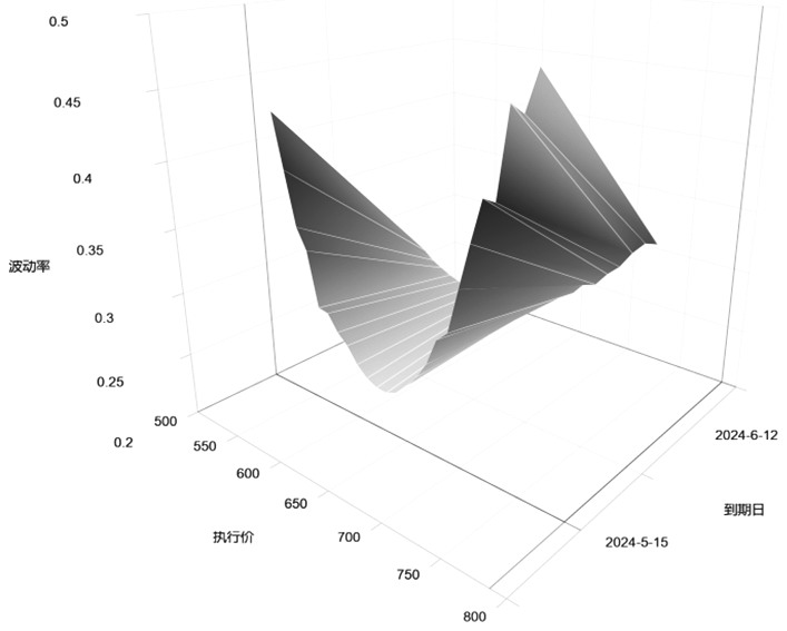 图二为原油波动率期限 将波动率微笑和波动率期限结合即得到三维的波动率曲面。从下面原油的波动率曲面图来看,不同执行价、不同到期日期权合约的波动率具有差异,可选择做多隐含波动率被低估的期权合约,同时做空隐含波动率被高估的期权合约,以获取隐含波动率回归的收益。 波动率曲面套利包括从某个品种相同到期日不同执行价的期权合约中寻找套利机会,买入波动率低估的合约,并卖出波动率高估的合约,以及从相同执行价不同到期日的期权合约中寻找套利机会,如当远期合约定价相较近期合约偏高时,可卖出远期合约,买入近期合约。