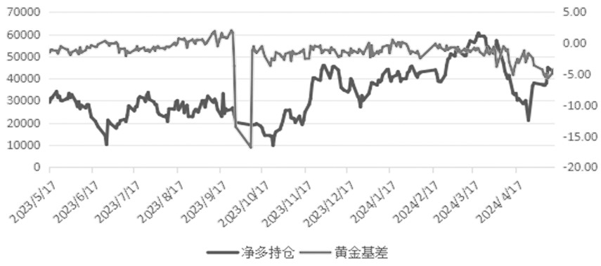 图为黄金基差与黄金顶部底部之间的关系 三是从当前整体交易量来看,上海黄金交易所的投资客户偏少,投资仓位可能是导致金银基差出现较大差别的主要原因。从下图中可以看出,净多持仓与黄金基差之间存在一定的联系,在大多数情况下,当净多持仓下降时,此时基差会出现一定程度的扩大。一般来说,净多持仓是先于基差1—2天见底或者见顶,说明投资仓位对黄金基差是有一定的影响。同时,当净多持仓维持在一个小范围波动时,基差的整体波动也是偏小,并且当净多持仓出现意外大幅增减仓时,可能会对基差产生比较大的影响。 综合来看,黄金基差的主要影响因素还是顶部和底部时期内对未来金价的预期,如果预期偏好,那么市场对远月合约价格的买入意愿就会偏强,此时黄金基差就大概率会走扩;如果预期偏差,那么市场对远月合约价格的买入意愿就偏弱,此时黄金基差就大概率会走缩。