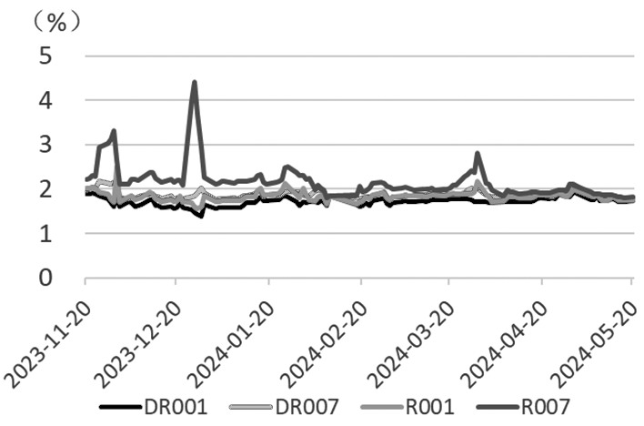 图为市场资金利率变化 4月,制造业PMI为50.4%(3月为50.8%)。通常,4月指标会略弱于3月,加之粗钢等产能调控,数据总体符合预期。分项指标上,主要原材料购进价格、出厂价格环比分别上升3.5个百分点、1.7个百分点。结合物价数据,当月,CPI同比上涨0.3%(前值为0.1%),PPI同比上涨-2.5%(前值为-2.8%),价格温和回升的趋势得到印证。 1—4月,固定资产投资(不含农户)同比增长4.2%(1—3月增速为4.5%),主要原因在于南方部分地区雨涝灾害影响项目施工进度。投资领域整体平稳增长,呈现出制造业投资稳定增长、技改升级投资和设备更新投资较快增长、大项目支撑有力的特点。 1—4月,社会消费品零售总额同比增长4.1%(1—3月增速为4.7%),主要拖累因素包括汽车零售表现偏弱、地产销售不佳影响装潢消费、企业降本增效导向下文化办公用品消费下降等。 出口方面,4月,我国对主要经济体,如东盟、欧盟、美国,出口金额(以美元计价)累计同比增幅均较前值有所回升,分别为6.3%(前值为4.1%)、-4.8%(前值为-5.7%)、-1%(前值为-1.3%),出口呈现边际改善迹象。 综合分析,后续宏观政策将着力稳基建、托地产、促消费、稳预期,而笔者重点关注超长期国债的发行节奏以及房地产政策的优化调整。