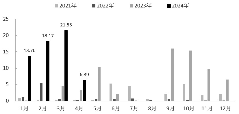 图为国内房地产开工、施工、竣工、销售面积累计同比增速(单位:%) [价格波动加大] 我国是全球最大的纯碱生产和消费国,产能全球占比近50%。因产能较大,国内纯碱常年维持净出口状态。2013至2022年,国内纯碱进口量整体维持在10万至30万吨,出口量维持在100万至200万吨,进出口均相对稳定。2023年,受国内纯碱价格阶段性大涨影响,纯碱进口量明显增加,年度进口量升至68万吨,创10余年来新高。在国内纯碱供需相对平衡的背景下,投资者需重点关注进出口的边际影响。国内纯碱进口主要是美国和土耳其的天然碱,其成本和价格大多低于国内。 2023年11至12月,国内纯碱现货价格上涨近1000元/吨,至2800元/吨,内外价差影响下,玻璃企业大量增加纯碱进口量,2024年一季度国内纯碱进口量约53万吨,同比增加49万吨,增幅1027%。一季度国内纯碱现货价格下跌,内外价差缩小,4至5月纯碱进口量下降,国内供应压力下降。但随着纯碱现货价格的上涨,进口预期增强,部分龙头企业在积极洽谈进口订单,以减少纯碱装置检修带来的价格冲击。预计6至8月份国内纯碱进口量将恢复至单月10万吨以上的水平。届时国内纯碱供应增加,价格波动或加剧。从全年维度看,预计2024年国内纯碱进口量将增加44万吨,至112万吨,出口量持稳至149万吨,净出口量较2023年小幅下降。