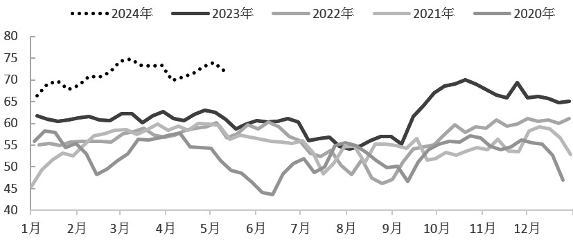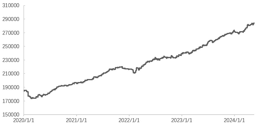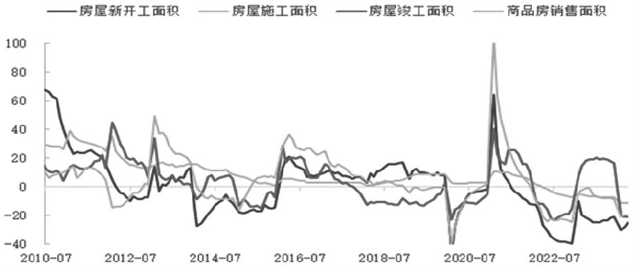 图为国内浮法玻璃与光伏玻璃日熔量之和(单位:吨) [国内宏观环境向好] 近期商品市场整体偏强势,除美联储降息预期升温外,国内宏观经济好转,稳地产政策密集出台也是重要驱动。2021年下半年以来,国内房地产市场景气度有所下降,目前仍处于寻底阶段。2024年1至4月,全国房地产开发投资30928亿元,同比下降9.8%;房地产开发企业房屋施工面积687544万平方米,同比下降10.8%;房屋新开工面积23510万平方米,同比下降24.6%;房屋竣工面积18860万平方米,同比下降20.4%;新建商品房销售面积29252万平方米,同比下降20.2%。截至4月末,国内商品房待售面积为74553万平方米。 为扭转行业预期、降低商品房库存,近期国内连续出台多项稳地产政策。4月底开始二线城市陆续放开限购,“住房以旧换新”“收购存量住房”等政策也陆续推出,上周央行宣布调整首套房最低首付比例并调降公积金贷款利率,同时宣布设立3000亿元保障性住房再贷款用于收购存量商品房。政策利好驱动下,市场预期出现改善,二级市场房地产板块明显反弹,大宗商品中铁矿石、玻璃、PVC等品种表现较强。后续随着地产销售的逐步改善,房企资金流好转或加速竣工进程,从而对玻璃需求形成支撑。浮法玻璃是纯碱最大的下游,浮法玻璃景气度改善对纯碱价格也形成一定支撑。