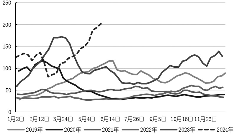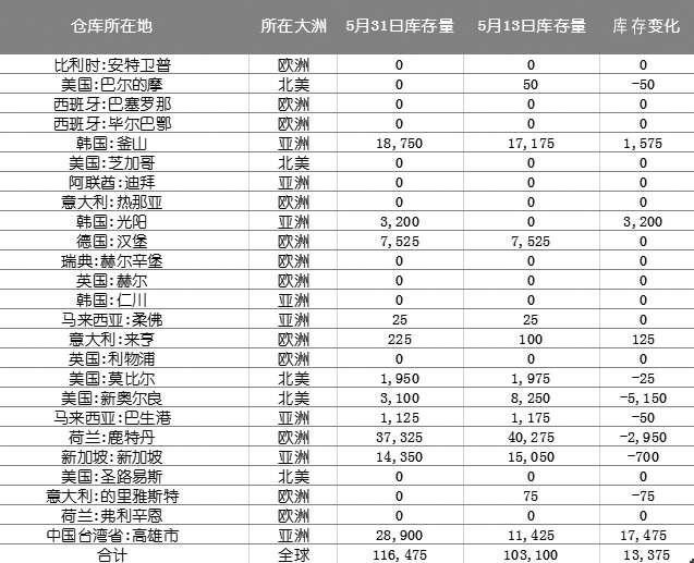 图为COMEX铜与LME铜价差(单位:美元/吨) LME铜库存连续累积,主要源于亚洲地区持续交仓 作为全球最古老且规模最大的有色金属交易市场,LME公布的金属库存数据可以反映铜市场的供需关系,对全球有色金属的价格、产销都有举足轻重的影响。由于5月13日开始COMEX铜与LME铜的价差明显扩大,本文针对库存变动分析的时间段选在5月13—31日。根据LME公布的数据,截至5月31日,LME铜库存报116475吨,较5月13日增加13375吨。在此期间,LME铜入库量累计25700吨,出库量累计12325吨。入库量和出库量是影响LME库存变化的重要指标,其中,入库是指金属存入LME仓库,经过检验符合LME标准后,这些金属货物将统计入库存数据,入库将导致LME库存总量增加。出库则是指金属从LME仓库中提出,用于实物交割,或转移到其他未被LME监控的地方,这些金属货物将从库存数据中减除,出库将导致LME库存总量下降。 LME铜累计入库的地区主要集中在亚洲。根据LME公布的数据,在LME铜累计入库的25700吨中,韩国釜山仓库入库量为3900吨,韩国阳光仓库入库量为3200吨,中国台湾省高雄市仓库入库量为18475吨;亚洲仓库合计入库量为18325吨,占到该时期总入库量的99.5%,其余0.5%的入库量发生在意大利的来亨仓库,为125吨。 LME铜累计出库的地区主要集中在北美。根据LME公布的数据,在LME铜累计出库的12325吨中,美国新奥尔良仓库出库量为5150吨,美国巴尔的摩仓库出库量为50吨,美国莫比尔仓库出库量为25吨,北美仓库合计出库量为5225吨,占到该时期总出库量的42%。其余出库地区分别为荷兰鹿特丹仓库,出库量为2950吨;韩国釜山仓库,出库量为2325吨;中国台湾省高雄市仓库,出库量为1000吨;新加坡仓库,出库量为700吨;意大利里雅斯特仓库,出库量为75吨;马来西亚巴生港仓库,出库量为50吨。 LME铜在各地区仓库的库存变化,反映了当前贸易流的走向。一是LME仓库发生出库的地区在美国,COMEX市场对LME市场溢价走高,存放在LME美国仓库的库存率先出库,转移到COMEX市场进行注册交割。截至5月31日,美国新奥尔良仓库铜库存3100吨,较5月13日减少5150吨;美国巴尔的摩仓库50吨库存全部出库,目前仓库库存已经清零。此外,美国莫比尔仓库仍有库存1950吨,较5月13日减少25吨。二是LME库存增加的地区主要发生在亚洲,可能的原因在于,受精废价差与内外价差扩大的影响,部分中国内地冶炼厂通过购买再生铜原料加工为电解铜,并布局出口取得价差利润。根据机构数据,4月中国内地的电解铜已经陆续发往LME在亚洲的各个仓库,5月下旬陆续到货,预计将有5万吨电解铜作为初步出口计划,部分大型冶炼企业计划有2万吨以上出口计划。截至5月31日,韩国阳光仓库库存3200吨,比5月13日增加3200吨;韩国釜山仓库库存18750吨,比5月13日增加1575吨;中国台湾省高雄市仓库库存28900吨,比5月13日增加17475吨。 综上所述,近期LME库存的变化基本反映了贸易流的走向,即LME各地仓库符合COMEX交割要求的货源将发往COMEX市场,中国内地的电解铜也开始外运,发往亚洲各个仓库。 短期COMEX铜市场挤仓风险虽然降温但风险仍存 COMEX铜市场挤仓行情缓和的关键在于区域性低库存的问题能否解决,这取决于两点:一是COMEX以外的铜市场是否能提供充足的可交割货源,二是当前航运运力能否满足货物的运输。