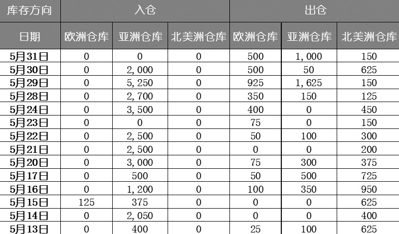 表为LME铜各地区仓库入库及出库情况(单位:吨)