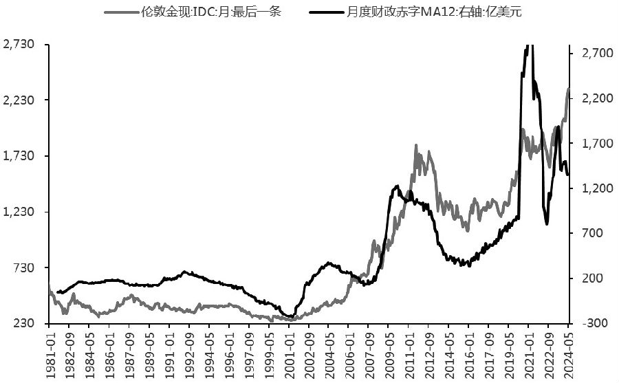 图为伦敦金价格(单位:美元/盎司)及美国月度财政赤字MA12(单位:亿美元) 上世纪80年代初,里根在就职演说中强调了对财政赤字的担忧,里根政府在注重税收减免的同时也进行财政开支的缩减。1981年里根在“经济复兴计划”中提出需要大规模减税以及缩减财政开支,并力争在1984年实现财政平衡。在里根第一个总统任期内,受到减税政策的影响,美国财政赤字水平不降反升。在此背景下,格林斯潘任主席的美国社会保险改革委员会在1983年提出了新的改革法案,并经里根签署生效。法案通过提高社会保障税及提高津贴领取条件等方式减轻联邦政府社会福利方面的支出。美国财政社会福利支出同比增幅由1982年四季度的15.28%下降至1984年二季度的0.33%。美国财政赤字水平在1983年后得到控制,但仍处于相对高位。1985年,戈尔巴乔夫担任苏联领导人,冷战进入最后阶段。美国国防开支增速显著放缓。1990年,美国联邦政府国防支出同比转负,美国财政赤字水平在上世纪80年代末明显收缩。与之对应,黄金价格仅在美联储两轮降息周期中出现趋势性上涨,国际金价运行中枢较上世纪70年代显著下移。 上世纪90年代,克林顿在首次国情咨文中旗帜鲜明地表达了削减赤字的决心,并提出了针对高收入群体的增税计划,对于年收入超过18万美元的人群税率由31%提升至36%。1996年二季度,美国联邦政府税收同比增幅达到11.73%,而税收占美国联邦政府经常性收入的一半以上,税收收入的增加改善了美国财政收入。同时,克林顿任期内冷战已经结束,财政支出中国防支出的压力减轻。美联储货币政策方面,联邦基金目标利率已由1989年5月的9.8%下降至1994年的3.25%,后续格林斯潘基于对通货膨胀的考虑执行新一轮加息周期,但上世纪90年代美国政策利率仍显著低于80年代沃尔克时期,因此,美国财政利息支出在这一时期有所减少,利息支出占财政经常支出的比重由1991年一季度的23.49%下降至2000年三季度的18.67%。1998—2001年,在克林顿第二个任期内美国实现财政盈余,这也是美国上世纪80年代至今唯一实现财政盈余的年份。此外,苏联解体后美国在全球推行霸权政治,计算机技术快速发展驱动美国经济发展,美股表现强势。美元信用在这一时期得到极大增强,黄金价格表现弱势。伦敦金价由1993年底的390美元/盎司下跌至2001年3月的257美元/盎司,持续数年表现弱势。 进入21世纪,恐怖袭击事件及美股互联网泡沫的破裂令美国不可避免地走向了宽财政之路。2003年3月,美国正式发动对伊拉克的军事行动。在前期的国情咨文中小布什明确表示,财政预算案包含了20年来国防开支的最大增幅,2003年底美国国防支出同比增长14.67%。经济政策方面,小布什政府推行多个针对个人及企业的减税计划,以促进就业和经济增长。小布什另一项重要政策是将“美国梦”和“自有住房”紧密绑定,明确表示自有住房符合国家利益,小布什政府推出《美国梦首付法案》,帮助低收入家庭支付房屋首付。美国住房自有率在2004年末达到69.2%。其间,与房屋贷款相关的金融衍生品大量发行,为后续次贷危机埋下伏笔。2004年美国年度财政赤字达到4127亿美元。 2008年美国次贷危机爆发,小布什以及继任者奥巴马先后推出多个经济刺激法案,旨在令美国走出危机阴霾。美联储则进行多轮QE,向市场释放大量的流动性。美国货币政策配合财政政策实施宽松,美国财政赤字大幅扩张,美元信用受到严重冲击,黄金价格表现强势。 2001—2005年底小布什第一个任期内,美国财政由2001年的盈余转为2005年赤字3000亿美元以上。国际金价由2002年1月底的282.6美元/盎司上涨至2006年4月的654美元/盎司。美国次贷危机爆发后,美国年度财政赤字由2008年的4585亿美元上升至2011年的1.3万亿美元,国际金价则由2008年3月的917美元/盎司上升至2011年8月末的1825美元/盎司。 2000年后开始的长期财政扩张令美国联邦政府债务余额上升,并在2011年引发严重的债务上限危机。民主党和共和党历经多轮协商在美债即将出现“技术性违约”的前夕达成协议,并通过《2011年预算控制法案》,法案直接规定联邦政府需要在10年内减少9170亿美元的开支,极大地限制了联邦政府可选支出的扩张。奥巴马后续通过《平价医疗法案》等方式削减预算赤字,美国财政赤字规模由2009年的1.41万亿美元下降至2015年的4419亿美元,同期国际金价迈入连续4年的熊市行情,由2011年8月底的1825美元/盎司下跌至2015年12月底的1061美元/盎司。 奥巴马任期结束后,特朗普及拜登政府继续走向宽财政之路,国际金价在2016年触底反弹后开启新一轮的牛市行情。特朗普政府在2017年成功通过《2017年减税与就业法案》,此法案令收入在9525美元之上的所有人群获得税收减免,法案同时包含对企业税收的减免及财产税免税额的增加。美国国会预算办公室预计该法案将令美国国家债务在10年内增加2.289万亿美元。特朗普执政后期,新冠疫情暴发,与2008年次贷危机时期的小布什以及奥巴马政府类似,特朗普及拜登政府先后通过《新冠病毒救助法案》《美国救援计划》及《美国基础设施和就业法案》等方式实施规模巨大的财政刺激,其中《美国救援计划》是美国历史上规模最大的经济救助计划之一。美国财政预算赤字规模由2016年的5850亿美元上升至2023年的1.69万亿美元,其间2020年达到高峰3.1万亿美元。伦敦金价则由2016年12月底的1151美元/盎司上