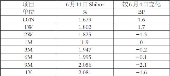 本周,国内市场利率呈现短升长降格局。一方面,临近年中,资金需求阶段性较旺,短端利率上行;另一方面,市场整体融资需求不佳,中长端利率下降。截至6月11日,上海银行间同业拆放利率(Shibor)隔夜、1周期利率分别报收于1.679%、1.802%,较6月4日分别上升1.6、1.7BP;2周期、3月期、6月期、9月期、1年期利率分别报收于1.825%、1.947%、1.995、2.056%、2.081%,较6月4日分别下降1.3、0.2、0.1、2.1、1.6BP。