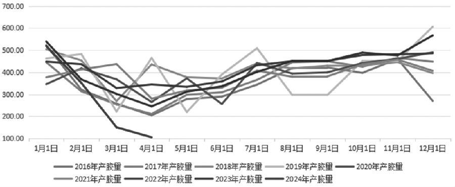 [美国制造业的复苏之路依旧波折] 近期美国制造业意外下滑引发市场对大宗商品需求减弱的担忧,同时美国通胀数据反弹也弱化未来美联储降息预期。数据显示,美国5月ISM制造业指数达到48.7,为3个月来最低,不及预期的49.6,4月前值为49.2。美国制造业的复苏之路仍然波折,单月实现的扩张也仅昙花一现。 ISM数据提升了年内美联储降息的预期,同时近期美债利率出现反弹,主要原因在于部分美联储官员表态继续偏鹰。在美债利率的带动下,美元指数也出现上行,海外风险资产再度承压。此外,美国5月非农就业人口增加27.2万,远超市场预期的18.5万。美国5月失业率升至4.0%,为2022年1月以来首次。今年4月美国CPI同比上涨3.4%,环比上涨0.3%;3月核心CPI同比上涨3.6%。4月美国生产者价格指数(PPI)同比上升2.2%,为一年来最高水平。随着美联储降息预期减弱,宏观氛围转向中性偏空。 [旱情因素导致产胶国割胶工作延后] 众所周知,天然橡胶树容易受到干旱因素的干扰而诱发减产。近两年来,全球厄尔尼诺现象凸显导致今年4—5月东南亚天胶产区遭遇旱情,从而导致产胶国胶水产量出现明显下滑。 泰国方面,从季节性来看,泰国东北部4月中下旬进入开割季,南部产区5月中旬进入开割季,今年产区开割基本符合季节性规律。但开割初期,泰国东北部和中部产区高温少雨,影响割胶工作。进入5月,泰国主产区先后迎来降雨,东北部割胶工作逐步展开,但南部产区受天气扰动,原料产出受阻,整体原料上量节奏相对偏慢。 越南方面,2024年开割季以来,越南产区整体开割进程较正常年景延后半个月左右。进入5月以后主产区降雨增多,5月上旬割胶工作陆续开展,目前处于快速开割当中。但开割初期,越南新鲜胶水产出较少,以流入浓乳厂为主,叠加浓乳生产利润支撑,当地浓乳橡胶加工厂基本处于全面复工状态。不过越南3L生产加工处于持续亏损中,从而导致工厂加工积极性较低,干胶厂基本尚未复工。直至5月底,伴随着胶水产出的逐步上量,以及干胶生产加工利润窗口打开,越南胶厂陆续发货,预计6月中下旬将集中到港。因此,相比于正常季节,全球主要产胶国泰国及越南产区新胶供应量在今年天气影响下,整体释放节奏延后且迟缓,从而对橡胶出口体量造成一定影响。 [进入新一轮开割季后供应压力趋增] 天胶生产国协会(ANRPC)最新发布的报告显示,4月天胶生产国协会成员合计产胶量达到54.97万吨,环比小幅回落1.34万吨,同比显著下滑17.83万吨。从累计水平来看,1—4月累计产胶量达293.3万吨,较去年同期的343.59万吨大幅下滑50.29万吨,降幅达14.64%。 不难发现,东南亚旱情对胶水产量的确产生了影响。不过随着季节性雨季到来,东南亚胶水产量正在稳步恢复。根据过去5年的产胶量数据,每年3—4月,全球天胶产量跌至年内低谷,而每年5月开始,天胶产区告别低产季,迎来新一轮割胶期,胶水产量逐月环比增加,供应压力稳步回升。