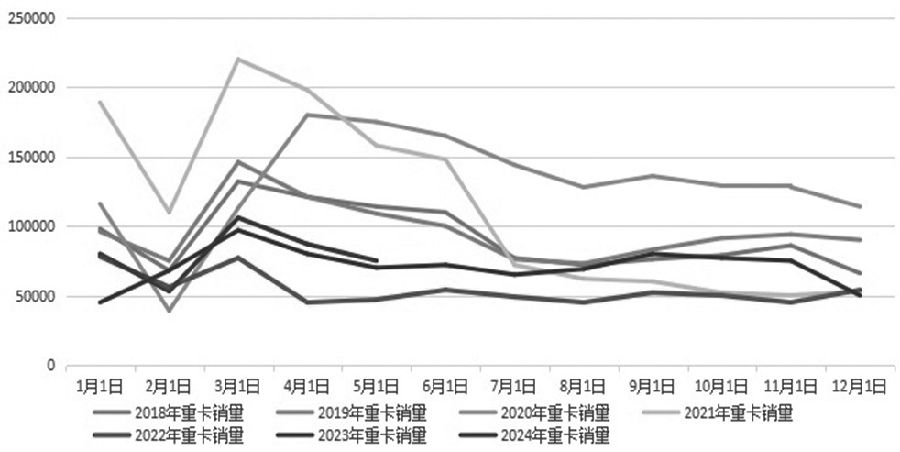 图为2014—2024年中国汽车经销商库存预警指数 受前期供应链上下游需求集中释放和部分地区需求动力偏弱等因素影响,5月中国物流业景气度指数为51.8%,较4月回落0.6个百分点。物流业景气度和国内重卡运输相关性较高,受此影响,作为天胶需求的“晴雨表”——重卡销量在2024年5月出现同比和环比双双回落的景象。据统计,5月我国重卡汽车销售约7.5万辆,环比大幅下降9%,较去年同期的7.74万辆也小幅下滑了3%。