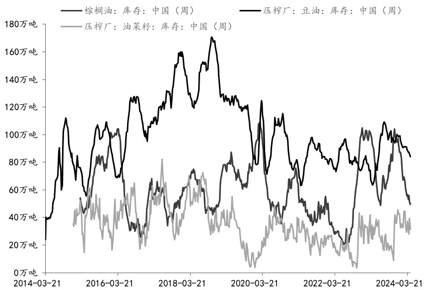 5月,大连豆油与CBOT豆油、大连棕榈油与BMD棕榈油走势基本一致。5月中上旬,在巴西过量降雨引发洪涝的情况下,CBOT豆油受到提振快速上行。5月中下旬,巴西洪水消退,CBOT豆类市场再度下跌,但高频数据显示美豆油出口较好,并且受马来西亚棕榈油出口表现强劲支撑,油脂市场在5月下旬整体呈现多空交织局面,大连豆油呈现窄幅震荡。国内棕榈油方面,因后续到港陆续增加,供应增加预期渐浓,基差报价在月末有所下跌,现货表现弱于盘面。 豆油基本面依然呈现供需宽松格局。海关总署的数据显示,5月国内大豆进口量约1022万吨,环比增长19.25%。根据市场对6月大豆到港约1060万吨的预估,二季度国内大豆进口量处于近年来的高位。预计后市豆油工厂开机率仍处于高位,一方面是因为目前国内压榨厂豆油库存处于90万吨左右的偏低水平,随着豆粕价格的上涨,工厂榨利有所回升;另一方面,豆油、棕榈油2409合约价差回落至200—300元/吨的区间内,在当前价差水平下,棕榈油难言大面积替代豆油。从现货端来看,根据张家港、厦门、广州、防城港四地区豆油、菜油价格调查统计,5月末豆油、菜油均价价差为-563元/吨,较4月末的-438元/吨扩大125元/吨,去年同期在-333元/吨左右。菜油需求清淡以及工厂开机率高导致菜油承压,而豆油市场需求向好,有着明显的价格优势。