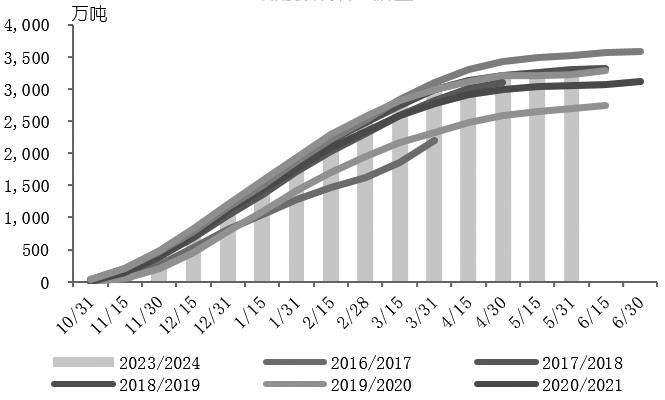 图为糖醇溢价(单位:美分/磅) 目前,对于巴西产量的预期调整,只能通过观察降水情况和糖醇溢价进行。对于产量趋势的现实兑现情况,需要看7月进入压榨高峰之后的表现。 [印度:2023/2024榨季减产不及预期 新榨季产量或恢复] 据印度糖厂联合会(NFCSF)发布的数据,2023/2024榨季截至5月31日,印度已有531家糖厂收榨,还有3家糖厂未收榨;甘蔗入榨量为31378.5万吨;累计产糖3167万吨。印度2023/2024榨季基本宣告结束,产糖量低于此前糖业协会(ISMA)3200万吨的预期。同时,印度政府在2023年10月至2024年5月向糖厂下发1960万吨糖销售配额,同比增加9%,因此此前基于2023/2024榨季印度糖净产量为3200万吨、消费量为2900万吨、期末食糖库存为900万吨的市场预期进一步调低,2024/2025榨季开局印度库存更为紧张。