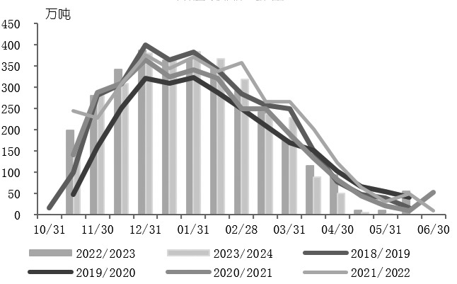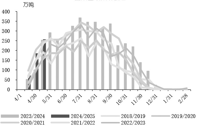 图为印度双周产糖量(单位:万吨) 而对印度2024/2025榨季的产量,矛盾点在于甘蔗生长情况。根据印度气象机构IMD的预测,2024年6—9月的季风降雨量将达到平均水平的106%。进入5月,印度降水量小幅恢复,5月中旬印度中部出现了暴雨预警,这意味着印度季风雨将在6月1日进入印度大陆,相较上个榨季6月9日有所提前,因此甘蔗需水期降水有保证。5月1—23日,印度降雨量为140毫米,历史同期平均水平为99毫米。 截至6月6日,印度150座水库的总蓄水量为397.65亿立方米,较去年同期下降了107.84亿立方米,降幅达21.33%。6月开始甘蔗主产区卡邦和马邦迎来降雨,水库水位后续将在季风雨持续向北移动中得到补充。机构对2024/2025榨季印度糖产量的预估增至3300万~3400万吨,存在增产预期。从需求端来看,按照印度食糖销售年增长率2.2%计算,2024/2025榨季印度食糖消费量将达到3000万吨,库存进一步紧张。 印度糖出口政策在2023年12月开始收紧,2024年至今出口配额仍未发放。市场普遍预期在印度大选结束之后,印度政府会对2023/2024榨季定产情况以及2024/2025榨季甘蔗播种情况进行评估后,决定食糖的出口额度。目前来看,由于2023/2024榨季印度产量预期调整,在大选结束后,增加出口配额的可能性偏小,并且乙醇分流将优于食糖出口。 综上所述,巴西糖供应偏快,但在干燥天气影响下,市场认为产量存下调的空间,并有提前结束榨季的可能。印度2023/2024榨季在5月基本定产,产量未及预期的3200万吨,导致2024/2025榨季期初结转库存进一步不足,6月调整出口限制的可能性较低。因此,短期受巴西5月双周供应不及预期以及印度出口暂无调整空间的影响,6月原糖价格下行空间有限,区间偏强震荡。(作者单位:中州期货) (责任编辑:admin) |