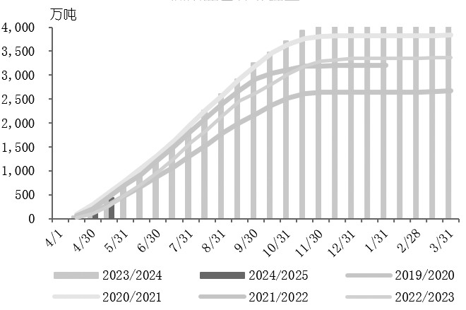 图为1—5月国内外糖价走势 总体来看,在巴西提前开榨、供应上量偏快、印度出口政策未见调整的情况下,全球糖市贸易流仍依赖巴西供给,巴西产量限制糖价上行空间。 [巴西:2024/2025榨季产量预估分歧大 关注降水量] 3月底,巴西2023/2024榨季糖产量定格。2023/2024榨季巴西中南部甘蔗累计入榨量为65443.4万吨,同比增加19.29%;产糖量累计4242.5万吨,同比增加25.70%;制糖比为48.87%,去年同期为45.86%。 受高利润驱动,巴西2024/2025榨季糖厂提前开始了压榨工作,降水量对巴西新榨季产量的影响成为市场关注点。5月31日,UNICA公布了5月下半月双周生产数据,5月下半月,巴西中南部地区甘蔗入榨量为4519.8万吨,较去年同期的4677.1万吨减少157.3万吨,同比降幅达3.36%;产糖量为270万吨,较去年同期的292.6万吨减少22.6万吨,同比降幅达7.72%。制糖比为48.28%,较去年同期的48.65%下降0.37个百分点。盘面提前反应,ICE原糖期货价格在公布前一个交易日上涨0.53美分/磅,最高触及19.67美分/磅。