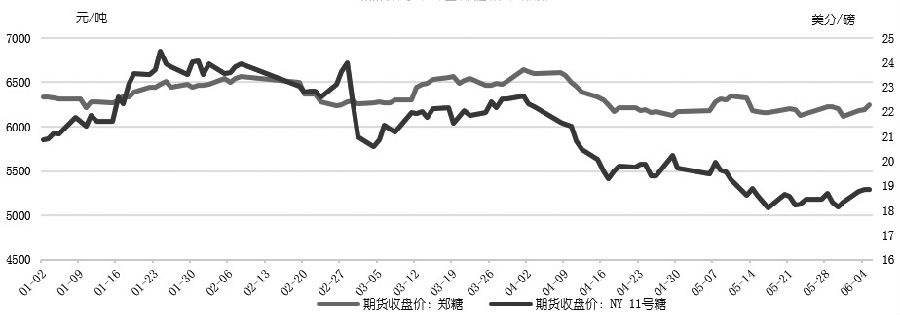 巴西供应存调整预期 印度出口政策暂无变化 自年初以来糖价震荡下跌,驱动因素主要是市场对2024/2025榨季存在增产预期。但巴西糖在干燥天气影响下存下调的空间,而印度2023/2024榨季在5月基本定产,产量未及预期,6月调整出口限制的可能性偏低。因此,短期原糖价格下行空间有限,区间偏强震荡。 [糖市:贸易流仍依赖巴西供应 巴西产量限制价格波动幅度] 自年初以来糖价震荡下跌,驱动因素主要是市场对2024/2025榨季存在增产预期。 2023年年底,巴西蔗糖行业协会(UNICA)公布巴西产量超预期,全球糖供需平衡表由短缺转向过剩,ICE原糖价格一路向下,而郑糖最低触及6105元/吨低位。 2024年1—2月,全球糖市供需预估相对平衡,糖价开始反弹修复。巴西产量超预期因素被市场逐步消化,而印度政府出台乙醇分流新政,限制糖向乙醇分流量,印度糖出口受限,支撑糖价。同时,国内春节假期前销售较好,现货表现强势,郑糖收于6566元/吨。2月下旬,受原糖期货2403合约淡季巨量交割131万吨的压制,郑糖快速下跌,之后在6230~6290元/吨区间震荡。进入3月,美联储降息预期以及原油上涨支撑宏观面,郑糖上行至6500元/吨一线后震荡运行。4月初,管控糖浆、糖粉的政策出台,郑糖主力2405合约最高触及6795元/吨。4月中上旬,巴西提前开榨,原糖、白糖价差小幅回落,供应压力使郑糖再度下行,5月中旬最低触及6090元/吨。5月底在巴西5月上半月制糖比不及预期的驱动下,郑糖小幅反弹至6300元/吨之上。