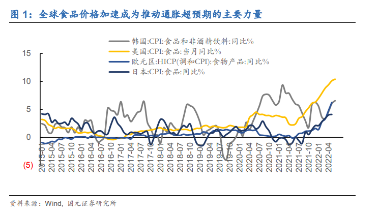 报告要点:1、当前令全球通胀超预期的主要是食品价格,美国、欧元区、日本及韩国等发达国家的食品价格都在加速,且成为推动通胀超预期的主要力量。 2、 其实在食品价格的内部已经存在着一些价格上的分裂: 1)初级农产品价格无论是同比还是绝对价格,其自Q1末出现的下行拐点已经确定,趋势性下行也在逐步得到验证; 2)但加工食品的价格还在加速。 3、经验来看,农产品成本的变动传导到加工食品价格平均还要6个月的时间,但这一次明显不是,在农产品价格减速10个月之后,食品价格依然还在加速,这说明整体食品价格在脱离经验轨道。 4、这意味着当前通胀的性质不仅仅是个流动性问题,还有预期问题,食品通胀固化背后仍然是通胀预期自我实现的路径还未完全打破: 1) 海内外供应问题造成的渠道不畅导致局部国家和地区的物资短缺,这为通胀自我实现创造了客观条件; 2) 而食品市场刚性需求的特征,强化了家庭部门通胀自我实现的主观驱动; 3) 原材料市场尾部风险抬升的成本压力一定程度上干预了生产部门定价,名义价格粘性导致当前通胀水平依赖于预期的未来通胀。 5、当前食品价格到底是因受阻的供应还是通胀交易而起,目前尚不能确定,直觉上,也许两个原因都在起作用,如此的话,这一轮食品价格所引起的通胀的后续场景很难判断,毕竟这一次通胀有很大的主观及行为的成分在。 6、但更大的复杂性在于:这一次的通胀也许会再反作用于客观世界,重新造成“薪酬-通胀”这一链条的螺旋上升。 7、虽然这一轮海外通胀可能已经演化到中后期,但当前时点跟踪的意义要远大于预测的意义,建议暂不要贸然做通胀反转交易,譬如做多美债、做空美元,但对于美股来说,经验上其反转的条件应该不是美国货币政策反转。 1.全球食品价格加速成为推动通胀超预期的主要力量 当前令全球通胀超预期的主要是食品价格,美国、欧元区、日本及韩国等发达国家的食品价格都在加速,且成为推动通胀超预期的主要力量。 ![]() 2.食品内部存在一定价格上的分裂,整体价格在脱离经验的轨道 2.1初级农产品价格无论是同比还是绝对价格,其自Q1末出现的下行拐点已经确定,趋势性下行也在逐步得到验证 本轮粮食上涨始于2020年4月,导火索依旧是疫情发生后的全球货币超发,在流动性宽松的环境下风险资产在触底反弹后,持续的通胀交易继续推升农产品价格走高,在2021年8月之前,全球M2同比和农产品价格走势延续历史经验表现出高度趋同;而2021年8之后,当全球M2同比已经拐头向下,而粮食价格在小幅回调之后今年再次迎来二次上涨,和转势的货币周期产生了大约6个月时间的背离,这也是这一轮粮价上涨呈现出的新特点: 1) 首先,CRB食品项的同比和M2同比向下的趋势一致,说明粮价运行区间仍然没有跳脱出货币周期的整体框架 2) 但是类似汽车的制动距离,粮价上涨的惯性驱动背后的原因也是多方面的,大致可以分为两大类;一类是短期不可证伪项,譬如自然灾害、地缘冲突以及粮食禁运的持续性造成的供应减量;另外一类则是短时加速项,譬如能源价格高位强化的粮食能源化。 ![]() 近期可以观察到粮食价格近期有相当幅度的回落。部分支撑价格走高的供应变量在部分证伪; 而后续预计随着短期产业基本面不可证伪的因素逐步落地,粮食价格回落的趋势和拐点将更加明确。因此,在成本维度上考虑,初级农产品价格正在迎接一个下行通道,而同比上看,自Q1末出现的下行拐点也已经确定,同比延续下行正在逐步得到验证。 2.2 但加工食品的价格还在加速 只是,不同于上游农产品原材料的拐点出现,加工食品的价格的上涨趋势并未中止,食品通胀发展至今已经由点及面,逐步成为全球性问题。如我们上文所提及的,无论是欧美地区还是亚洲的发达经济体,食品通胀的火苗已经愈演愈烈。 2.3. 整体食品价格在脱离经验的轨道 经验来看,农产品成本的变动传导到加工食品价格平均还要6个月的时间,但这一次明显不是,在农产品价格减速10个月之后,食品价格依然还在加速,很大程度上这说明整体食品价格在脱离经验轨道。 3. 当前通胀的性质不仅仅是个流动性问题,还有预期问题 这意味着当前通胀的性质不仅仅是个流动性问题,还有预期问题。因此通胀管理不仅仅是流动性管理也关乎预期引导,食品通胀固化背后仍然是通胀预期自我实现的路径还未完全打破,而这个原因也是多方面的: 严格意义上,通胀预期自我实现的路径不是传统经济学理论范畴,而更多和行为经济学的博弈相关。当企业和居民普遍预期原料成本或商品价格仍会加速上涨的时候,一方面,企业基于后续成本继续上升的担忧联合提价,另一方面,居民担心推迟购买成本会进一步提高,购买需求在短期内提升完成预期的自我实现,物价和消费者通胀之间形成正反馈。而投机资金参与的中间渠道囤货和抢货行为或将进一步增强通胀的粘性。 尽管通胀预期自我实现并不是导致通胀的根本原因,但其对通胀持续性的考量上不可忽视。可以观察到,当前的一些因素仍然在推升着通胀预期自我实现对通胀形势的正反馈: 3.1 首先,供应渠道不畅是通胀自我实现的客观条件 供应渠道我们可以从全球贸易以及本土产业链两个维度考虑: 全球贸易的健康发展和产业供应链的畅通是“低通胀,高繁荣”的重要保障。而2020年以来受疫情多发、地缘冲突等多