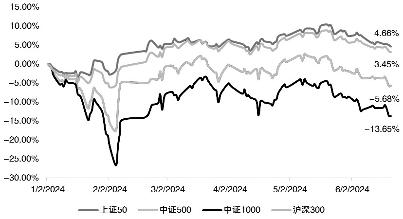 2024年上半年A股走势较为波折,截至6月23日,规模指数涨跌不一,其中上证50指数上涨4.66%,沪深300指数上涨3.45%,中证500指数下跌5.68%,中证1000指数下跌13.65%。整体看,大盘指数强于中小盘指数,主要原因为:第一,上半年上涨驱动主要源于政策层面的支持,比如降息超预期落地、稳定房地产政策接连加码等。政策入场驱动顺周期行业领涨,而以金融地产为代表的顺周期行业中,蓝筹股权重较高,因而大盘指数表现相对更优。第二,“国家队”入场对大盘指数的支撑更加明显。第三,新“国九条”出台之后,“1+N”政策逐步推出,强监管下市场对中小企业的风险担忧加大,中小盘指数也相应回调,两轮冲击加深了中小盘指数的回撤深度。