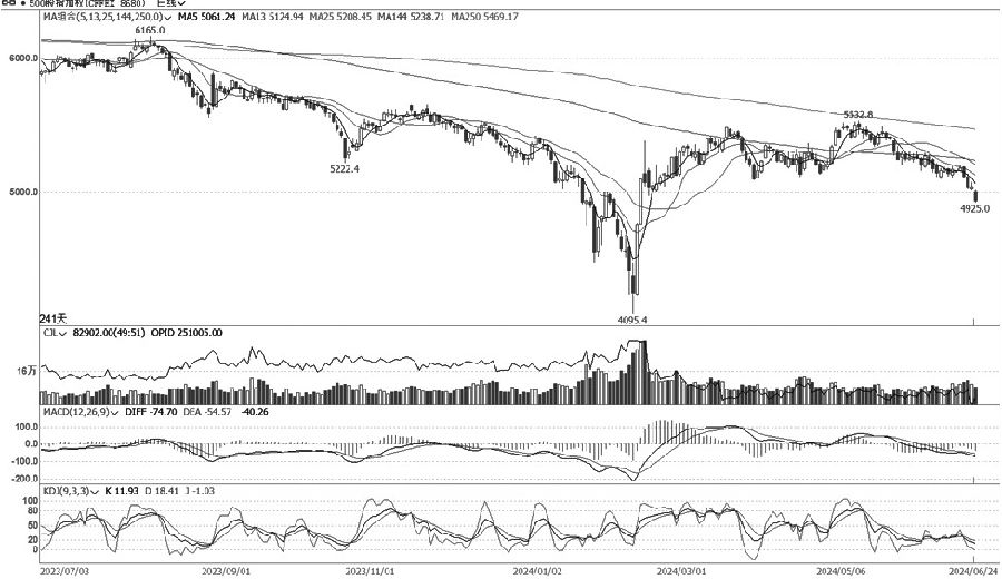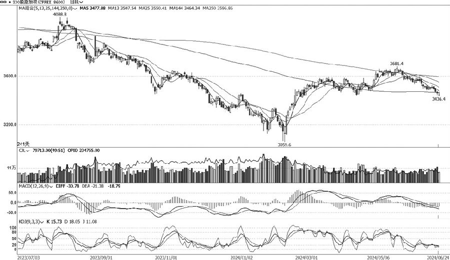 IC加权延续调整走势,且近期量仓等指标与日K线趋同。周一早盘低开低走,弱势震荡至尾盘,以小阴线报收。当前主连合约较现货指数贴水较多,净基差波动接近正常水平,短期期货较现货指数略偏弱。主连合约大幅增仓,远月合约亦不同程度加仓,整体仓位大幅增加,同时成交量能较前期明显缩减,近期建议以下跌趋势策略为主。近期IC加权量价仓等指标趋同性略高,MACD绿柱开始走扩,KDJ快线在低位运行,日K线破位调整远离短期均线。建议观望为主,可择机日内高抛。 T 多单持有