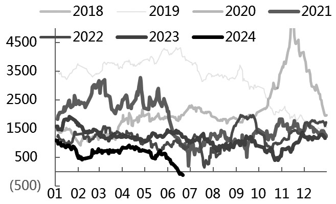 图为2024年亚洲(除中国以外)纯苯检修损失(单位:千吨) 原料纯苯远月供需结构偏紧程度缓解为此次价格下行的主要原因。6月中旬,韩国部分装置计划重启,估算纯苯总产能约70万吨,届时每月带来增量约5万吨,叠加近期有消息称,美国歧化装置有重启可能,当前关闭产能近100万吨,但目前确定重启产能约10万吨。 贸易流向方面,韩国是亚洲地区主要的纯苯生产国之一,同时也是近10年来中国最主要的进口地区,韩国纯苯主要出口至中国及美国。假设在美国歧化装置陆续重启,美韩套利窗口关闭情况下,大部分韩国月度产量增加量或出口至中国。叠加7月苯乙烯、酚酮、苯胺等下游存检修计划,纯苯或从二季度持续去库转为累库状态,偏紧局面缓解。此外,往年随着5月底进入出行旺季,美国汽油裂解差通常随着汽油库存一路向下而走高,因此,对高辛烷值原料之一的芳烃存在较高需求,但今年美国汽油库存并未明显去化,汽油裂解价差不增反降,反映出需求相对平淡。在亚洲芳烃检修维持高位的情况下,预估芳烃调油利润不及前两年水平。 苯乙烯7月仍处于供需双弱局面,供需矛盾不突出。供应方面,7月计划检修量与6月水平相当,但当前随着苯乙烯非一体化及POSM工艺的亏损(二者产能占比共计达70%),后续有装置检修或降负的概率仍然较高。苯乙烯下游进入传统淡季,从7月空调排产数据来看,内销同比下降12.5%,在前期旺季备货后,渠道库存累积至较高水平,短期终端需求难以跟进,后续三大家电总排产数据预计出现回落。 近期随着苯乙烯价格回落,三大下游利润逐步修复,但在下游订单难以跟进情况下,开工率提升仍有限。根据贸易商及工厂反馈,由于今年利润较低,工厂多采取原料及成品库存双低的策略维持运转,生产销售形式也从此前的以产定销向以销定产转移,且今年3至5月备货力度较大,但实际表现尚不及预期,库存积累较多,三大下游对苯乙烯多以刚需采购为主,观望情绪较浓。 估值方面,纯苯上游的石脑油端,6月以来亚洲价格呈现上行趋势。据了解,主要原因是亚洲石脑油进口量回落,以及对7月日本乙烯裂解装置重启的预期。但是当前乙烯-石脑油价差依旧维持较低水平,在裂解利润难有明显起色的情况下,石脑油需求表现略显平淡,按照近3年石脑油同期650~750美元/吨的波动区间估算,近端纯苯-苯乙烯价差倒挂,处于历史低位,但随着纯苯远月合约边际转弱及苯乙烯检修降负增加,苯乙烯利润或有所修复。但是从远月合约来看,纯苯-苯乙烯价差仍有700元/吨以上水平,在苯乙烯自身供需矛盾不突出的情况下,远月价差仍以压缩为主。后期随着纯苯回调让利,苯乙烯估值压力在9300元/吨附近。