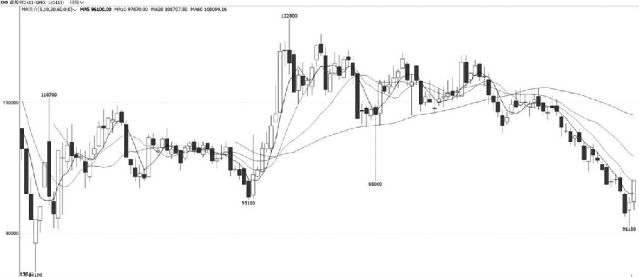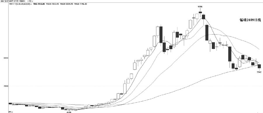 本周,碳酸锂2411合约价格最低跌至91150元/吨一线后止跌回升,该位置是去年12月低点,具有一定的支撑。量能方面,在价格止跌反弹过程中,成交量明显放大,持仓量同样出现增长。指标方面,均线系统处于空头排列,MACD指标快慢线在零轴下方运行,但绿色能量柱有所收敛。综合来看,碳酸锂2411合约日线架构止跌反弹,并向上突破10日均线,建议短线偏多思路对待。 锰硅 继续下调