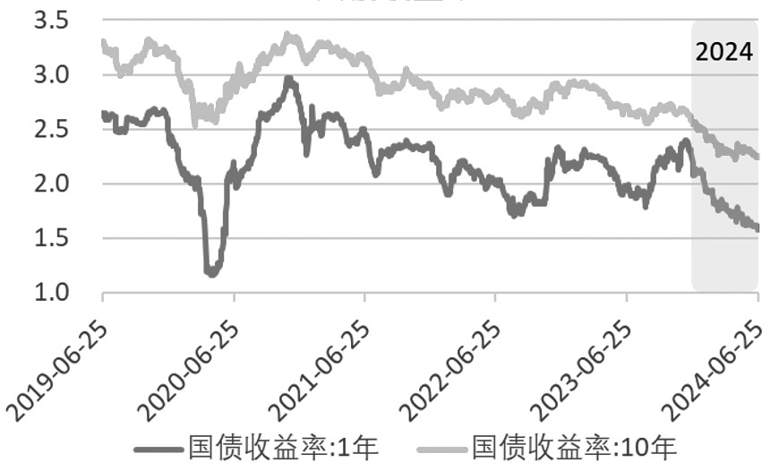 截至6月26日收盘,6月国债期货整体上行,从短端到长端,涨幅逐步扩大。2年期、5年期、10年期、30年期品种9月合约累计涨幅分别为0.16%、0.44%、0.77%、2.36%。现券市场收益率走低,最新数据显示,1年期、10年期国债收益率分别为1.56%、2.22%,较5月底分别下行9个基点和10个基点,较去年年底分别下行52个基点和35个基点。资金利率方面,最新数据显示,隔夜和7天期上海银行间同业拆借利率(Shibor)分别为1.98%和2.08%,由于半年末临近,上述利率较5月底抬升约20个基点。 市场利率整体低位运行 当前货币政策维持稳健基调,5月,央行缩量续做1年期中期借贷便利(MLF),利率持平于2.5%。同期,贷款市场报价利率(LPR)不变,1年期、5年期以上LPR分别为3.45%和3.95%。虽然MLF利率、LPR持稳,但市场利率实际仍在走低。其一,作为中长期国债收益率标杆的10年期国债到期收益率,5月下行10个基点,至2.22%,年内已累计下行35个基点;其二,5月17日房地产市场多项优化调整政策出台,首套房贷款利率下调已在部分城市落地;其三,近期多个地区中小银行再次调降存款挂牌利率,以应对净息差压力。 经济基本面指标分化 消费、出口边际改善,物价回升但仍在低位,投资则表现一般,地产领域继续对投资形成拖累。5月制造业PMI为49.5%(4月为50.4%),处于荣枯线下方,但总体好于去年同期。分项来看,主要原材料购进价格指数、出厂价格指数分别为56.9%和50.4%,分别较上月回升2.9个百分点和1.3个百分点;新订单、新出口订单、原材料库存、产成品库存等指数走弱,均位于50下方。此外,5月CPI同比上涨0.3%,与上月持平;PPI同比上涨-1.4%,较上月上升1.1个百分点,价格温和回升,但需求有待进一步恢复。 投资领域,1—5月固定资产投资(不含农户)同比增长4%,较1—4月下降0.2个百分点,其中房地产开发、基建、制造业投资同比增速分别为-10.1%、6.7%和9.6%。房地产投资增速在负值区间继续下滑;基建投资表现尚可,后续关注基建项目落地实施进度;制造业投资保持较高增速,主要受补库、出口修复、设备更新等因素提振。 消费方面,5月社会消费品零售总额同比增长,较上月提升1.4个百分点,此可能与“五一”假期的拉动有关。1—5月社会消费品零售总额累计同比增长4.1%,处于偏低水平。主要消费品中,汽车、建筑装潢等增速较低,设备更新、以旧换新政策带来部分领域消费增长。 出口方面,5月我国对主要经济体如东盟、欧盟、美国的出口总额(以美元计价)累计同比增幅分别为9.7%、-3.9%和0.2%,均连续第2个月回升,显示外需相对稳定。
