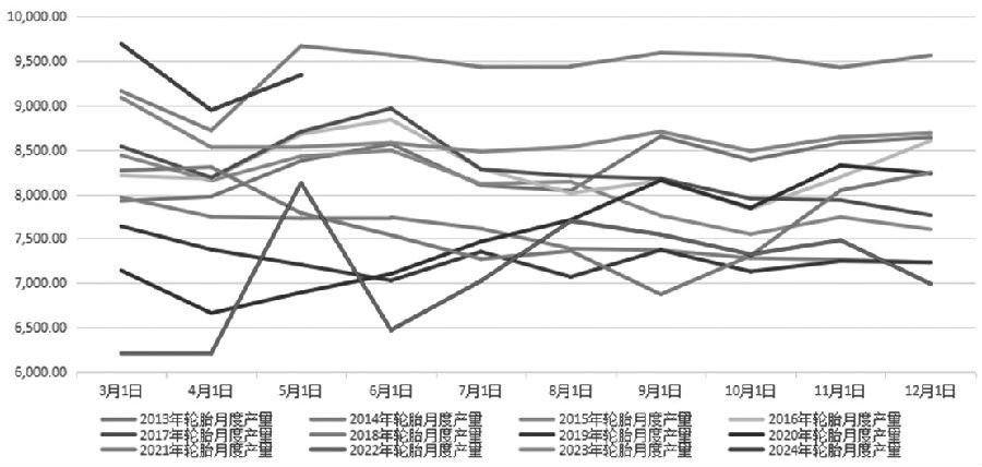 图为我国天然橡胶及合成胶进口量(单位:万吨) 导致国内进口橡胶规模下滑显著的原因有三方面:首先是由于2023年同期基数偏高,因此今年同期进口量承压。其次是内外盘倒挂严重,我国进口天然橡胶意愿受挫。最后是海外产区5月开割不畅,新胶释放缓慢,出口放缓。 国内天然橡胶主要用于轮胎生产,而轮胎需求强弱又取决于终端车市景气度。步入二季度以来,国内车市销量增速有所放缓,终端零售经销商库存压力增加。据了解,5月,国内汽车产销分别完成237.2万辆和241.7万辆,同比分别增长1.7%和1.5%,增速较4月明显下降。今年前5个月,国内汽车产销累计完成1138.4万辆和1149.6万辆,分别同比增长6.5%和8.3%。 在终端车市消费减弱的影响下,经销商库存开始积压。1—5月,我国汽车经销商库存预警指数均值为59.98%,较去年同期的59.62%略微上升0.36个百分点,表明1—5月国内汽车流通行业整体处于不景气状态。随着夏季到来,国内车市消费步入淡季,未来终端需求驱动力量或进一步减弱。 [海外订单增多推升轮胎行业景气度] 步入2024年以来,红海危机持续,中东和南亚地区轮胎企业供应出现滞后现象,尤其是印度轮胎企业开始向渠道加收附加费用,更是让轮胎经销商担心轮胎订单的时效性和稳定性。于是海外采购订单纷纷转向中国轮胎企业,推动行业景气度持续攀升,国内轮胎企业呈现产销两旺的景象。数据显示,我国轮胎50%以上依赖出口贸易。5月,我国出口新的充气橡胶轮胎5638万条,同比小幅增长4.8%;1—5月,我国出口新的充气橡胶轮胎26593万条,同比大幅增长9.5%。在外贸出口旺盛的驱动下,国内轮胎产量也同步增长。数据显示,5月,我国生产的橡胶轮胎外胎数量为9340万条,不仅环比上涨4.4%,而且较去年同期大幅增长9.5%;1—5月,我国生产的橡胶轮胎外胎数量达到43212.9万条,同比大幅增长11.1%。