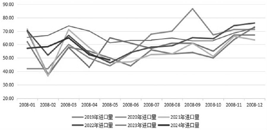 图为泰国月度产胶量(单位:千吨) [国内天胶下游终端车市需求转弱] 我国天然橡胶进口依存度高达80%,是国内橡胶供应的主要构成部分。不过,步入2024年以来,我国橡胶进口量显著下滑。数据显示,5月,我国天然橡胶进口量为34.77万吨,不仅环比下滑5.87%,而且同比大幅萎缩26.46%;1—5月,我国天然橡胶进口量累计212.56万吨,同比减少64.15万吨,跌幅达23.18%。